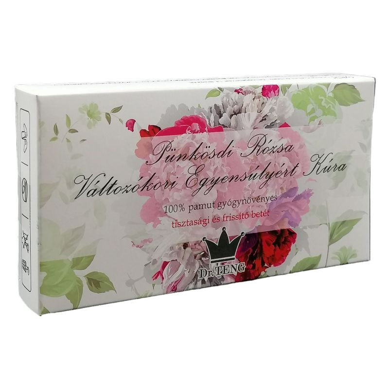 A pünkösdi rózsa jelentése: jólét, szerencse, boldogság. A Dr. Teng pünkösdi rózsa változókori egyensúlyért kúra alkalmazható: az idősebb kori hormonváltozások miatt, az irritáció megszűntetésére, vagy a tisztulás céljából. Forró kéz-láb, hőhullám, éjszakai izzadás, álmatlanság (változó kori tünetek) esetén. Stressz, ingerlékenység, szorongás, álmatlanság esetén. Száraz nyálkahártya, a hüvely-, a bőr-, a haj szárazsága esetén, amikor a ráncos bőr hidratálására van szükség. Ilyen esetekben rendszeresen lehet használni. Fáradtság esetén is rendszeresen lehet használni. Szexuális vágy hiányakor. Ha a menstruáció kevés, vagy előbb jön meg, az immunrendszer erősítése, feltöltése céljából. Májfoltok előfordulásakor, azok csökkentésére. Magas vércukorszint, magas vérnyomás, csontritkulás megelőzésére.