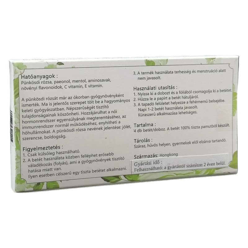A betét felépítése: a betét tisztított gyapotból készült, 100% pamut. Felépítése: mikroszálas fedőréteg, gyógynövények, nedvességzáró réteg. A doboz 4 db, egyenként külön csomagolt, fóliával higiénikusan lezárt betétet tartalmaz.