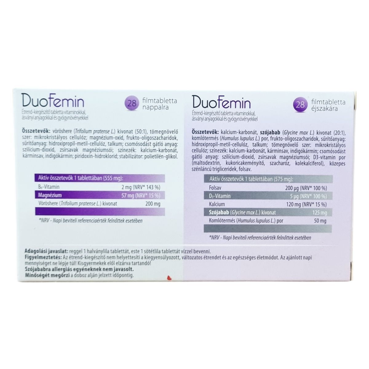 A DuoFemin egy speciális étrend-kiegészítő, amely nappali és éjszakai tablettákból áll, így 24 órás támogatást nyújthat a menopauza idején. A nappali tabletták fő hatóanyagai közé tartozik a vöröshere kivonat, amely segítheti a hőhullámok elviselését. A magnézium és B6-vitamin hozzájárulhat az idegrendszer normál működéséhez, valamint a magnézium, kalcium és D-vitamin támogatja a normál csontozat fenntartását. Az éjszakai tabletták tartalmaznak kalciumot, D3-vitamint, folsavat, szójabab-kivonatot és komlótermés port, melyek kombinációja hozzájárulhat a szervezet éjszakai regenerálódásához. Az adagolás egyszerű, naponta két tablettát szükséges bevenni, egyet reggel és egyet este, vízzel. Az allergén információ alapján szójababra allergiások számára nem ajánlott a termék szedése. A DuoFemin rendszeres használata mellett fontos a kiegyensúlyozott étrend és az egészséges életmód fenntartása.
