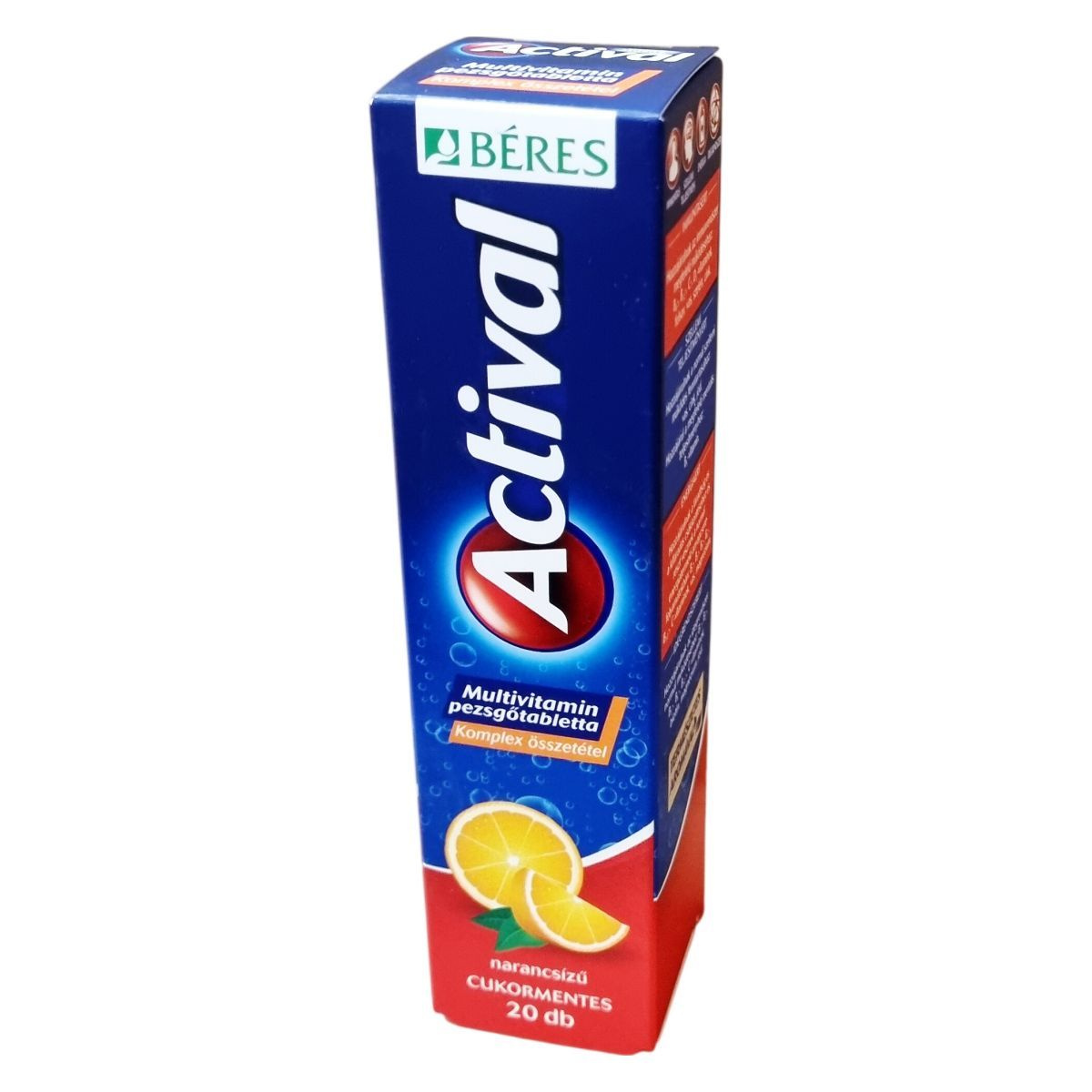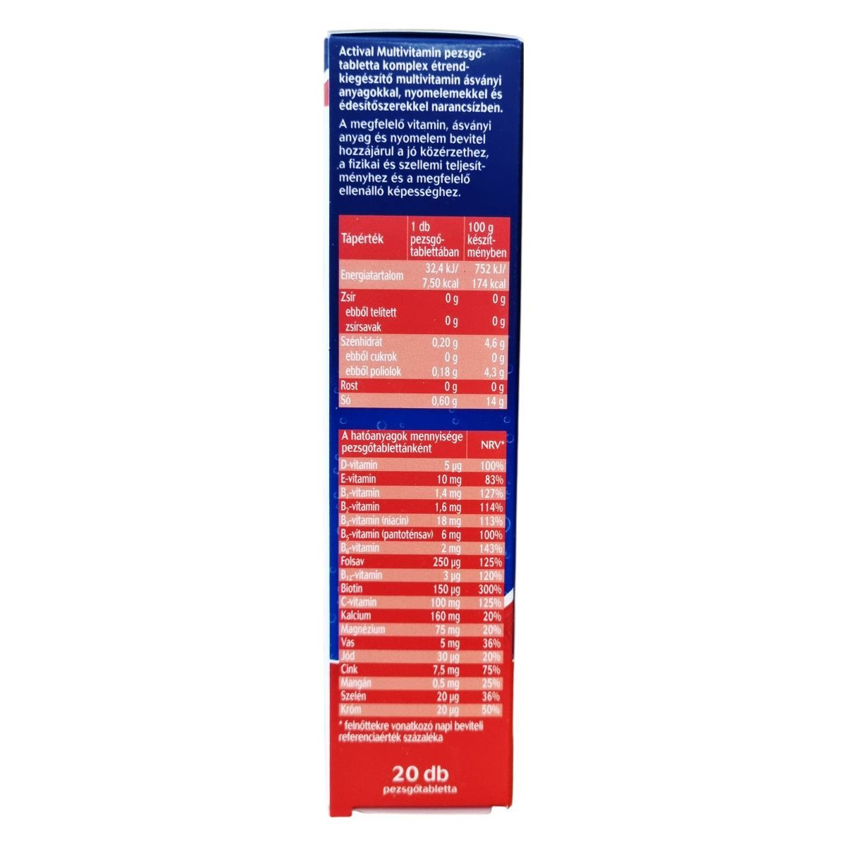 Az Actival multivitamin pezsgőtabletta narancsízű, cukormentes készítmény, amely komplex összetételének köszönhetően különféle vitaminokat, ásványi anyagokat és nyomelemeket tartalmaz. Támogathatja az immunrendszer működését, hozzájárulhat a normál szellemi működés fenntartásához és a megfelelő mentális teljesítményhez, továbbá segítheti a fáradtság csökkentését és az energia-anyagcsere folyamatait. Összetevői között szerepelnek többek között B-vitaminok, C- és D3-vitamin, vas, cink, magnézium, jód és szelén. Az aktív hatóanyagokat egy pohár vízben oldva ajánlott fogyasztani. A termék természetes aromát tartalmaz, és egy doboz 20 pezsgőtablettát foglal magában.