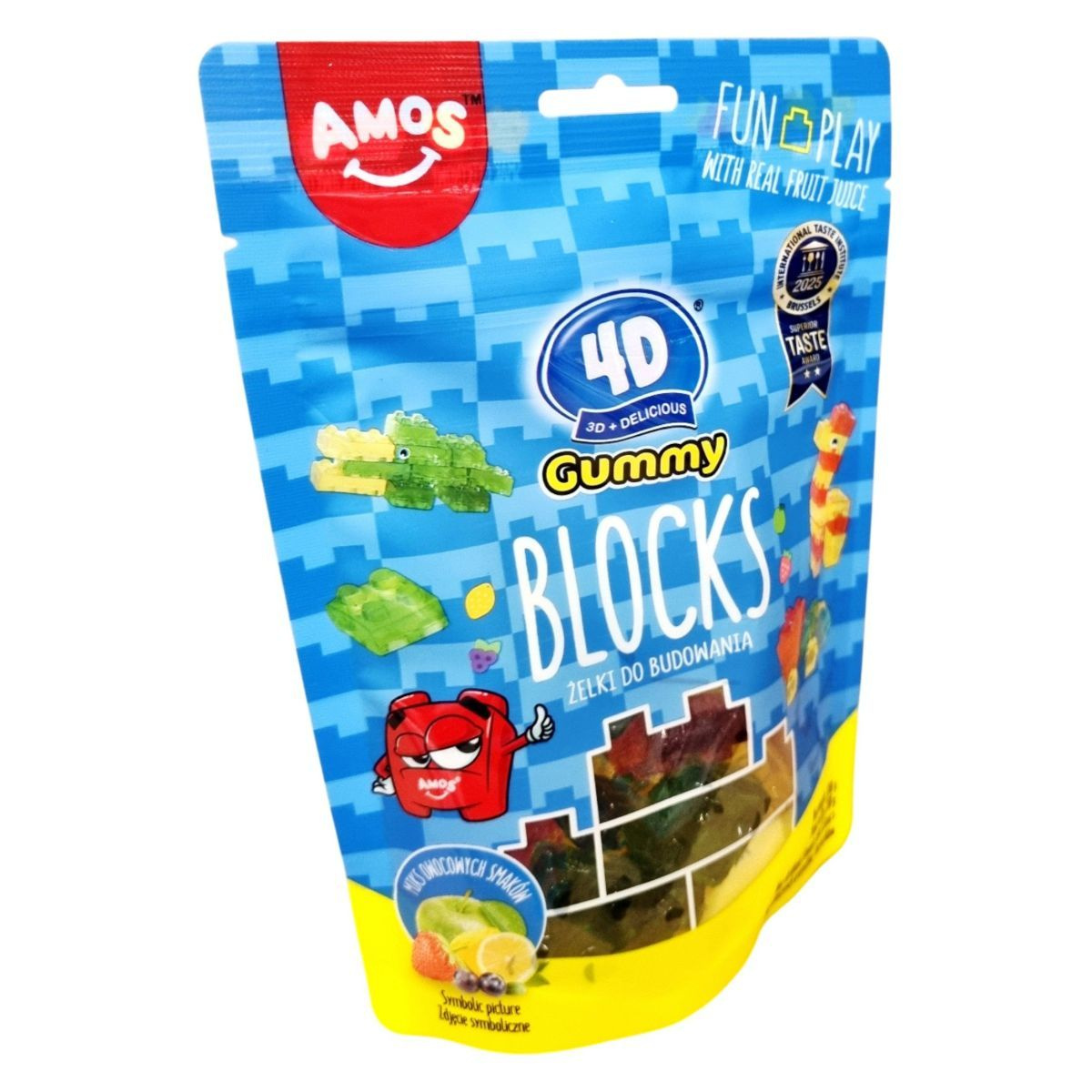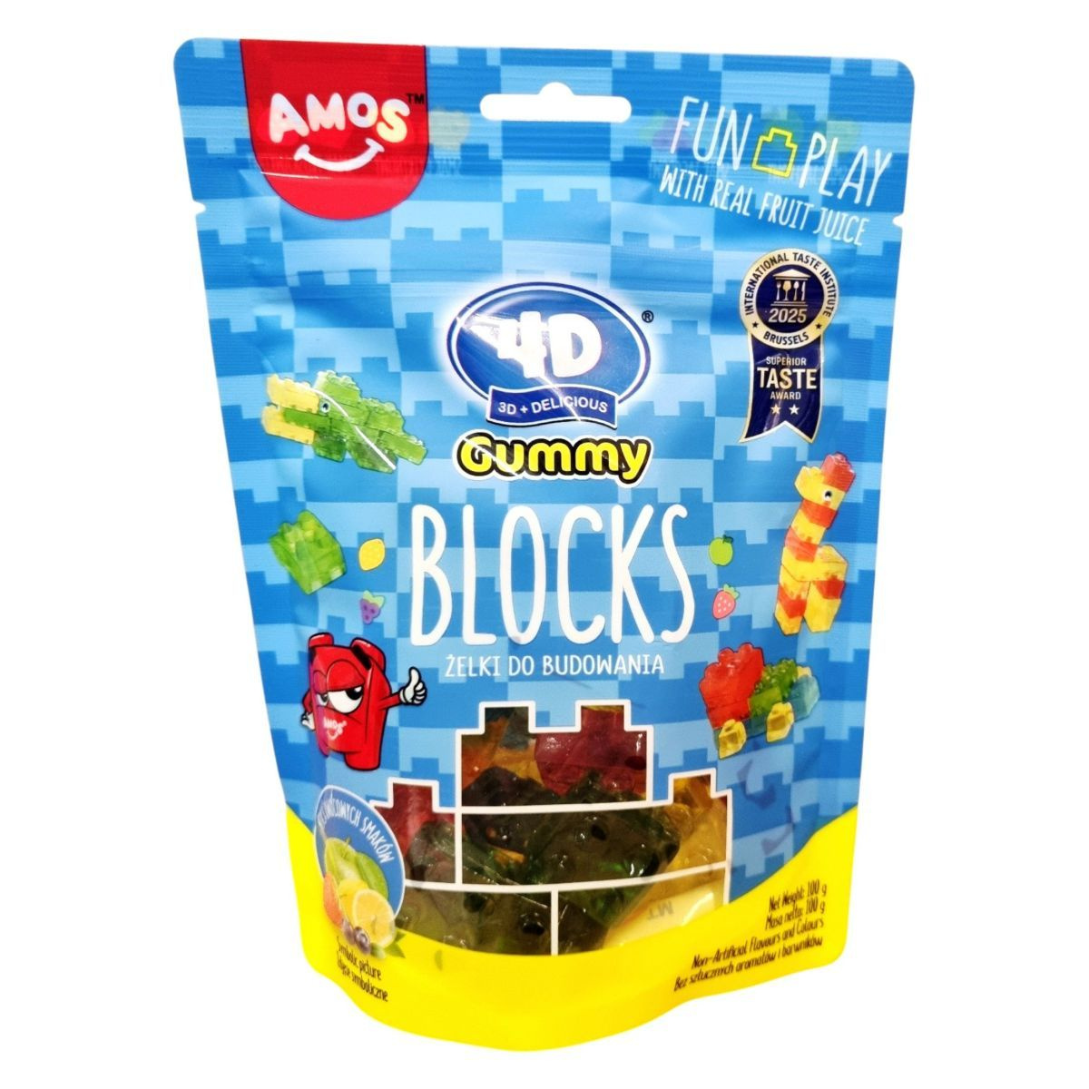 Amos 4D Blocks: vegyes gyümölcsízű (alma, áfonya, citrom, eper) építhető gumicukorka. A csomagolás szórakoztató dizájnnal, „fun play with real fruit juice” szlogennel hirdeti a játékos fogyasztási élményt. Nem tartalmaz mesterséges aromákat és színezékeket. Származási ország: Kína.