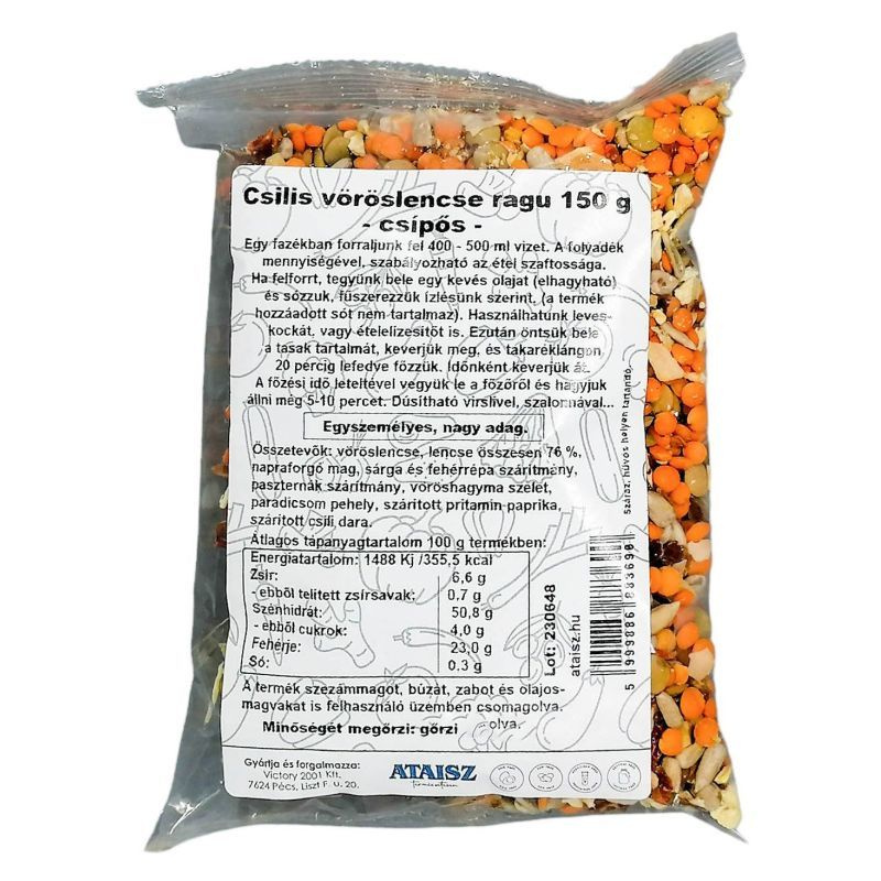 Összetevők: Vöröslencse, lencse, napraforgó mag, sárgarépa szárítmány, fehérrépa szárítmány, paszternák szárítmány, vöröshagyma szelet, paradicsom pehely, pritamindara, szárított chili dara.