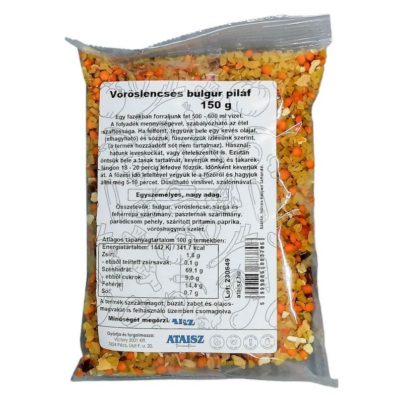 Összetevők: Bulgur, vöröslencse, sárga és fehérrépa szárítmány, paszternák szárítmány, paradicsom pehely, szárított pritamin paprika, vöröshagyma szelet.