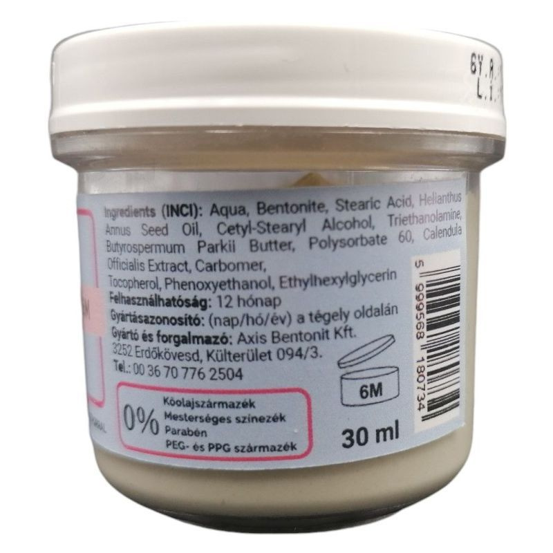 Összetevők: Aqua, Bentonite, Stearic Acid, Helianthus Annus Seed Oil, Cetyl-Stearyl Alcohol, Triethanolamine, Butyrospermum Parkii Butter, Polysorbate 60, Calendula Officialis Extract, Carbomer, Tocopherol, Phenoxyethanol, Ethylhexylglycerin.