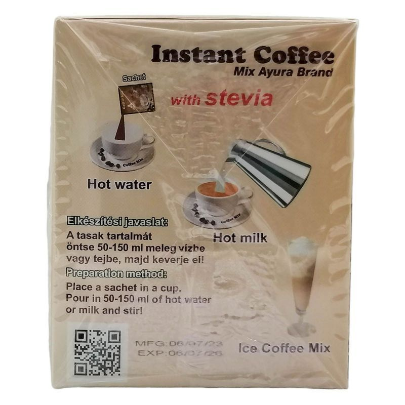 Instant Arabica kávé gyógynövényekkel, Stevia-val édesítve és pálma tejport tartalmaz.
