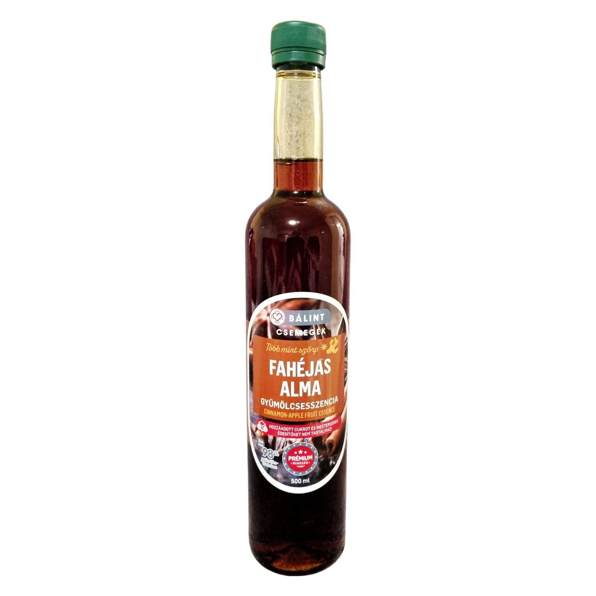 A fahéjas alma gyümölcsesszencia almából készült, fahéj, gyömbér és szegfűszeg kivonattal ízesítve. Meleg italokhoz és desszertekhez ajánlott, cseppmentes kiöntővel és környezetbarát csomagolásban kerül forgalomba. A termék kizárólag az alapanyagok természetes nátriumtartalma miatt tartalmaz sót.