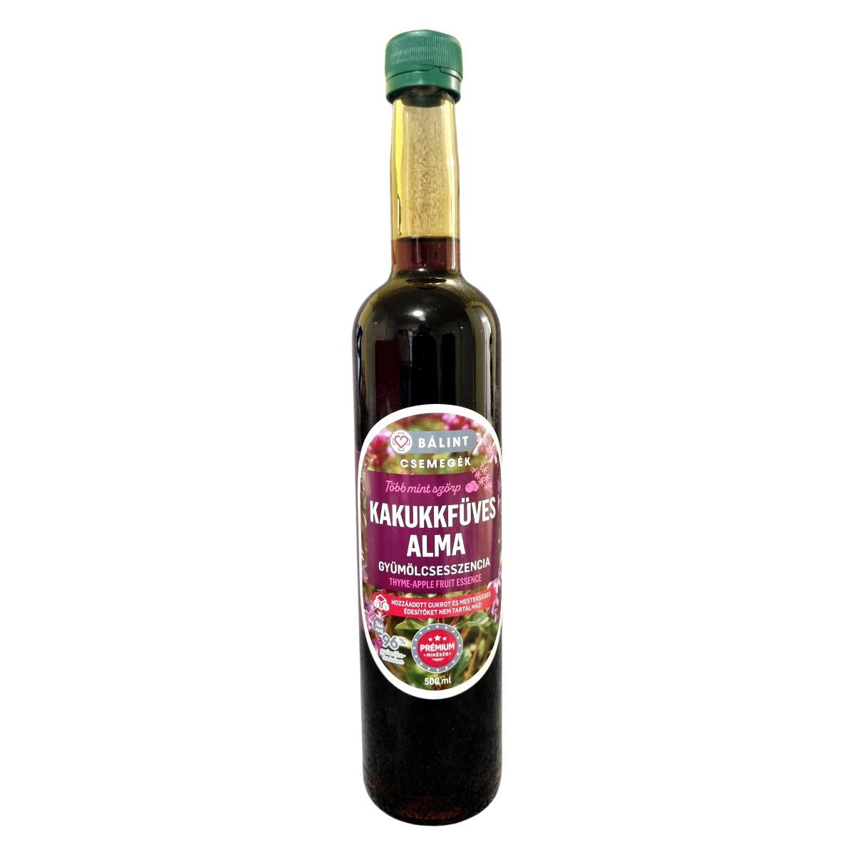 A kakukkfüves alma gyümölcsesszencia feketeribizlivel gazdagított, prémium minőségű termék. Cseppmentes kiöntővel ellátott, környezetbarát csomagolásban kerül forgalomba, és kizárólag az alapanyagok természetes nátriumtartalmából adódóan tartalmaz sót.