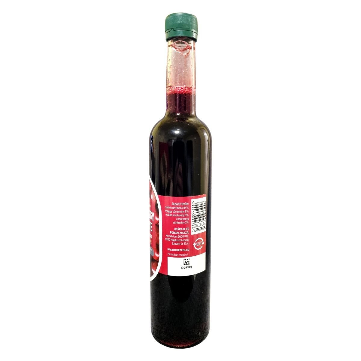 szőlő sűrítmény 84%, meggy sűrítmény 8%, málna sűrítmény 6%, cseresznye sűrítmény 2%