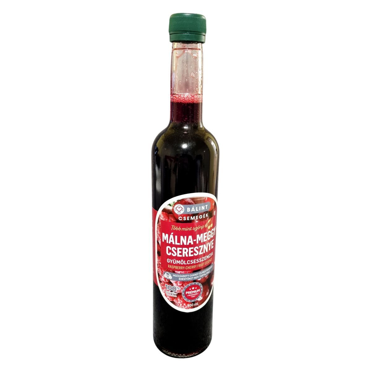 A málna–meggy–cseresznye gyümölcsesszencia szőlő, meggy, málna és cseresznye sűrítmény felhasználásával készül. Cseppmentes kiöntővel ellátott, környezetbarát csomagolású prémium termék, amely kizárólag az alapanyagok természetes nátriumtartalma miatt tartalmaz sót.