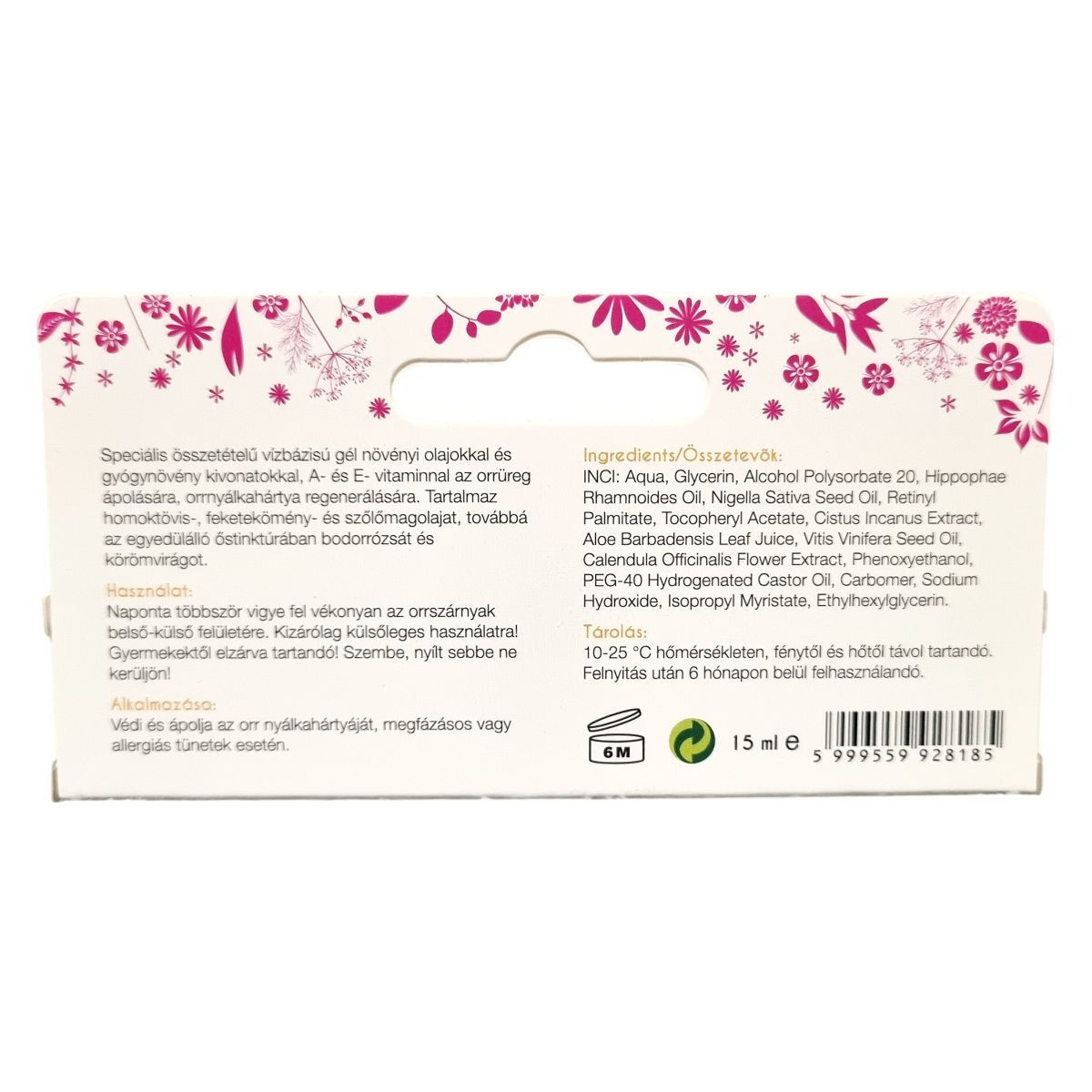 Speciális növényi olajokkal és gyógynövény-kivonatokkal készült vízbázisú gél, amely támogatja az orrnyálkahártya ápolását és regenerálódását megfázás vagy allergia esetén.