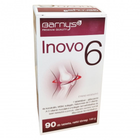 A barny's® Inovo 6 kombinált növényi és állati eredetű étrend-kiegészítő, amely glükozamin-szulfátot, kondroitin-szulfátot, MSM-t, II. típusú kollagént, hialuronsavat és C-vitamint tartalmaz. A C-vitamin hozzájárulhat a kollagén termelődéséhez, ami támogatja a porcok és csontok normál állapotának fenntartását. A termék összetevői természetes módon megtalálhatók az ízületekben, kötőszövetekben és porcokban. A termék gyártása az Európai Unió területén történik, és a biopol GN s.r.o. gyártja, míg a forgalmazást a VOGUSZ HUNGARY Kft. látja el. A tabletták adagolása egyszerű, a tabletták szükség esetén könnyen félbe törhetők vagy szétmorzsolhatók a nyelési problémák megkönnyítésére. A termék használata mellett ajánlott a változatos és kiegyensúlyozott étrend és egészséges életmód fenntartása.