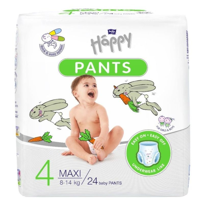 A Happy Pants a QUICK&EASY SYSTEM fejlesztésnek köszönhetően egy könnyen cserélhető pelenkanadrágot jelent: egy mozdulattal felvehető, levételkor a könnyedén feltéphető oldalak pedig még egyszerűbbé teszik a pelenkacserét. Légáteresztő anyagok, kiemelkedően jó nedvszívás, szuperkényelmes viselet.A PANTS Maxi méret ajánlott 8-14kg közötti gyermekek számára: lányoknak, fiúknak egyaránt.