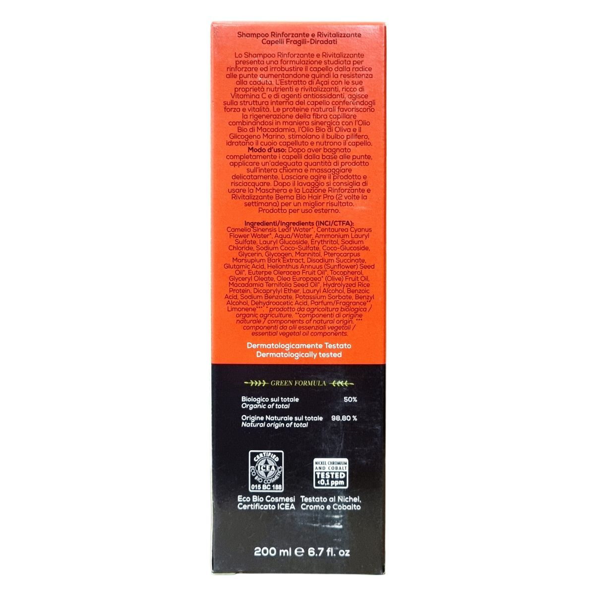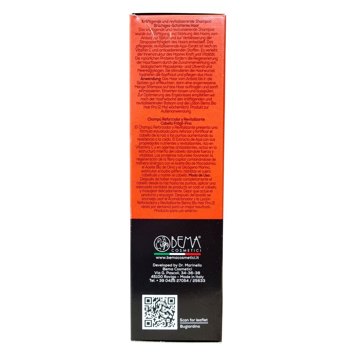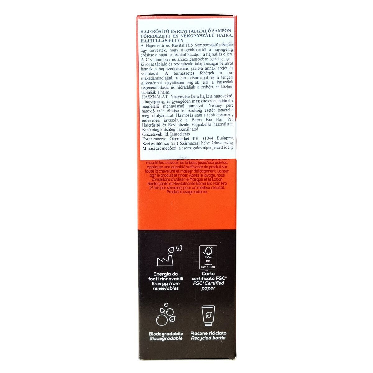 A Bema Bio Hair Pro Hajerősítő és Revitalizáló Sampon egy gondosan kifejlesztett formula, amely a haj gyökereitől egészen a végekig hat, hogy javítsa a hajszálak ellenálló képességét és csökkentse a hajhullást. Az antioxidánsokban és C-vitaminban gazdag açaí-kivonat belülről táplálja a haj szerkezetét, míg a természetes fehérjék, a bio makadámiaolaj, bio olívaolaj és tengeri glikogén együttesen segítik a hajszálak regenerációját. Ezek az összetevők stimulálják a hajhagymákat, hidratálják a fejbőrt és táplálják a hajat, így egészséges, vitalitással teli hajkoronát eredményeznek. A sampon dermatológiailag tesztelt, bio összetevőinek aránya a teljes formulában 50%, természetes eredetű anyagok aránya pedig 98,8%. A termék csomagolása környezetbarát módon készült: újrahasznosított palackban van, FSC® tanúsítványú papírcsomagolásban, biológiailag lebomló, és energiaigénye megújuló forrásokból származik. A termék az olaszországi Bema Cosmetici fejlesztése és gyártása.