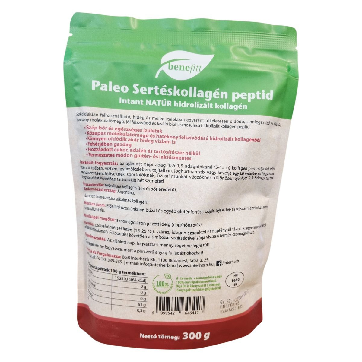 A benefitt Paleo Sertéskollagén peptid egy adalékmentes, natúr, ízesítetlen italpor, amely sertés eredetű hidrolizált kollagén peptideket tartalmaz. Fehérjében gazdag termék, amely hideg és meleg italokban egyaránt jól oldódik, és természetes módon glutén- valamint laktózmentes. Széles körben használható, akár teában, vízben, gyümölcslében vagy joghurtban is fogyasztható, és alkalmas paleolit étrendhez. Az előállító üzem nem használ fel búzát, gluténforrást, szóját, tojást, tej- és tejszármazékokat, ezáltal segíthet az allergének elkerülésében. A termék csomagolóanyaga 100%-ban újrahasznosítható, így környezettudatos választás lehet.