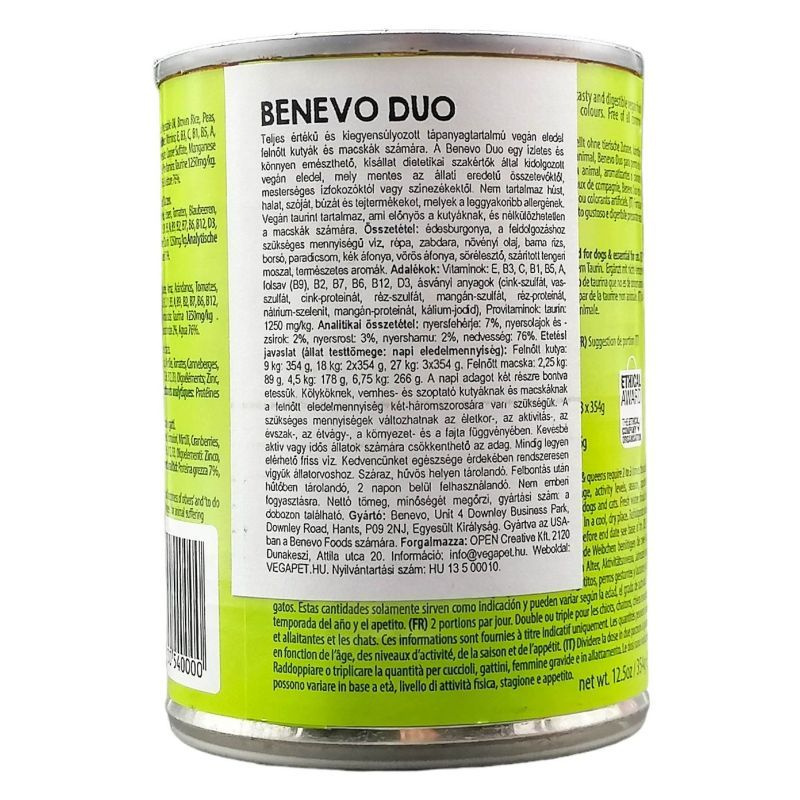 A Benevo Duo egy ízletes és könnyen emészthető, kisállat dietetikai szakértők által kidolgozott vegán eledel, mely mentes az állati eredetű összetevőktől, mesterséges ízfokozóktól vagy színezékektől. Nem tartalmaz húst, halat, szóját, búzát és tejtermékeket, melyek a leggyakoribb allergének. Vegán taurint tartalmaz, ami előnyös a kutyáknak, és nélkülözhetetlen a macskák számára. Összetétel: édesburgonya, a feldolgozáshoz szükséges mennyiségű víz, répa, zabdara, növényi olaj, barna rizs, borsó, paradicsom, kék áfonya, vörös áfonya, sörélesztő, szárított tengeri moszat, természetes aromák. Adalékok: Vitaminok: E, B3, C, B1, B5, A, folsav (B9), B2, B7, B6, B12, D3, ásványi anyagok (cink-szulfát, vas-szulfát, cink-proteinát, réz-szulfát, mangán-szulfát, réz-proteinát, nátrium-szelenit, mangán-proteinát, kálium-jodid), Provitaminok: taurin: 1250 mg/kg. Analitikai összetétel: nyersfehérje: 7%, nyersolajok és -zsírok: 2%, nyersrost: 3%, nyershamu: 2%, nedvesség: 76%.