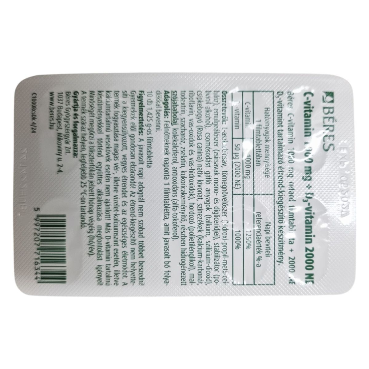 A Béres C-vitamin 1000 mg + D₃-vitamin 2000 NE étrend-kiegészítő filmtabletta formájában kapható, és a C-vitamin antioxidáns hatásával, valamint a D₃-vitamin csontok egészségére gyakorolt potenciális hatásával támogathatja az immunrendszer normál működését. A termék összetevői között megtalálható a csipkebogyó natív kivonata, valamint különböző stabilizátorok és antioxidánsok. A termék fogyasztása nem ajánlott bizonyos egészségügyi állapotok esetén, és fontos, hogy a javasolt napi adagot ne lépjük túl. A Béres Gyógyszergyár Zrt. által gyártott termék száraz helyen, legfeljebb 25 °C-on tárolandó.