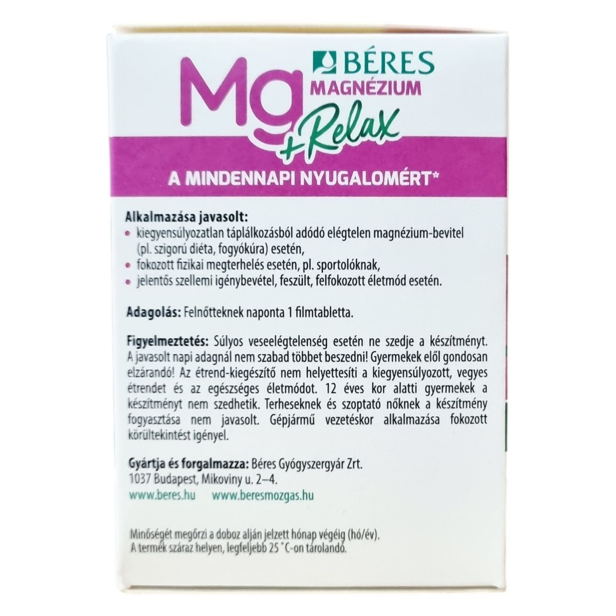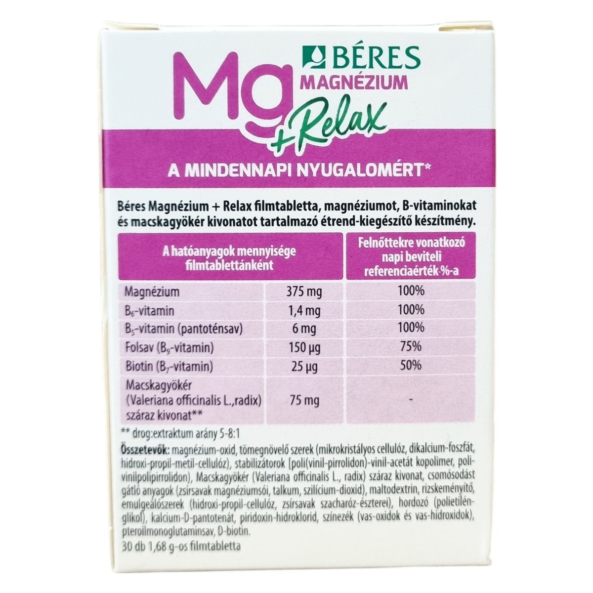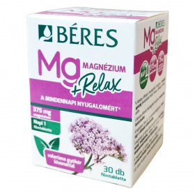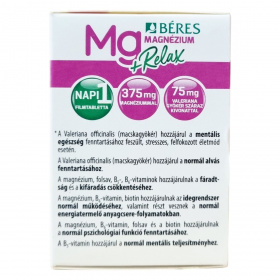 A Béres Mg Magnézium +Relax egy filmtabletta formájában kapható étrend-kiegészítő, amely magnéziumot, B-vitaminokat (B5, B6, B7, B9) és Valeriana officinalis (macskagyökér) száraz kivonatot tartalmaz. A macskagyökér hozzájárulhat a mentális egészség fenntartásához, különösen feszült, stresszes és felfokozott életmód esetén, valamint támogathatja a normál alvás fenntartását. A magnézium és B-vitaminok hozzájárulhatnak a fáradtság és kifáradás csökkentéséhez, valamint az idegrendszer normál működéséhez. A készítmény ajánlott kiegyensúlyozatlan táplálkozás, fokozott fizikai megterhelés és jelentős szellemi igénybevétel esetén. A filmtabletták 1,68 g-osak, és a termék 30 darabos kiszerelésben érhető el.