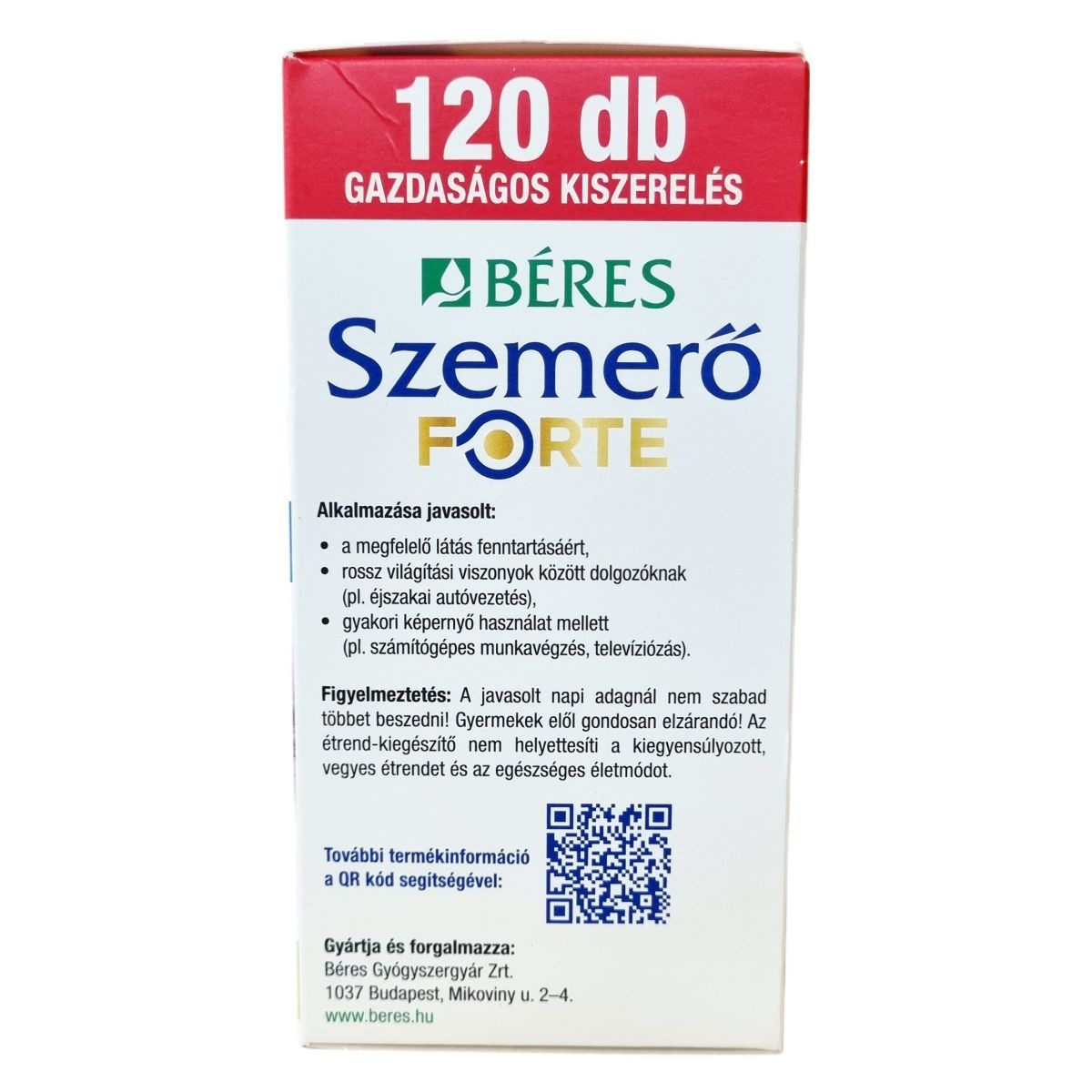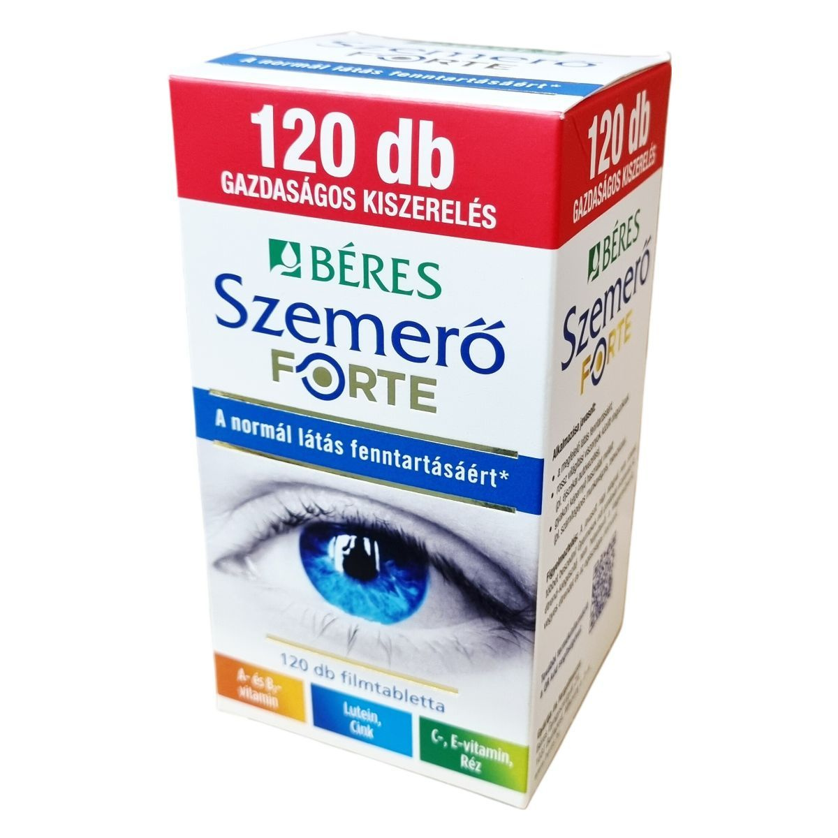 A Béres Szemerő FORTE filmtabletta vitaminokat, ásványi anyagokat és luteint tartalmazó komplex étrend-kiegészítő készítmény, amelyben az A-vitamin és a B2-vitamin hozzájárulhat a normál látás fenntartásához. A cink szintén hozzájárulhat a normál látás fenntartásához és részt vehet az A-vitamin normál anyagcseréjében. A C- és E-vitamin, valamint a réz antioxidáns hatásuk révén támogathatják a sejtek oxidatív stresszel szembeni védelmét. A készítmény természetes eredetű luteint tartalmaz, amely a retina és a szemlencse egyik fontos összetevője, és nagy bársonyvirág kivonatából származik. A termék különösen javasolt a megfelelő látás fenntartásáért, rossz világítási viszonyok között dolgozóknak, valamint gyakori képernyőhasználat mellett. A filmtabletták gazdaságos kiszerelésben, 120 darabos csomagban érhetők el.