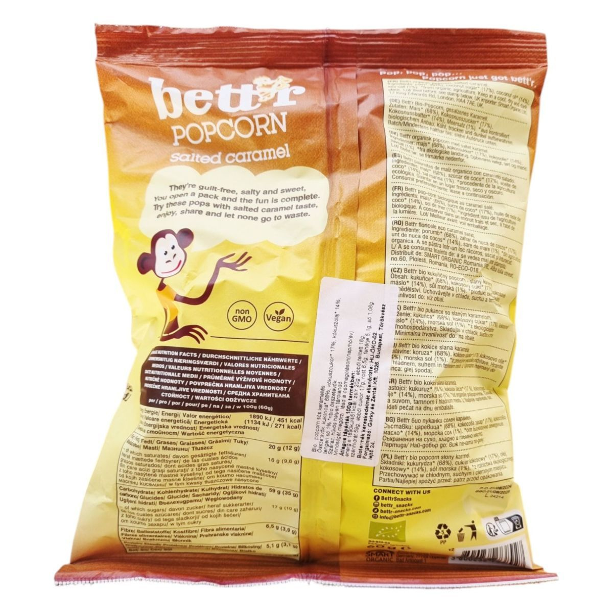 A bett'r sós karamellás popcornja bio és vegán, amely kókuszolajjal készül. Élvezd a sós és édes ízek tökéletes harmóniáját bűntudat nélkül!