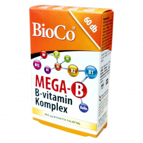 A BioCo MEGA-B B-vitamin Komplex egy Magyarországon fejlesztett és gyártott étrend-kiegészítő, amely magas dózisú, komplex B-vitaminokat és kolint tartalmaz. A készítmény kizárólag bioaktív folát formában tartalmaz folsavat, ezáltal jelentős mennyiségben (400 µg) járulhat hozzá a folátbevitelhez. A B1-vitamin segítheti a szív megfelelő működését, a B1-, B2-, B3- és B6-vitaminok támogathatják az idegrendszer egészségét, míg a B6-, B12-vitaminok és a folsav hozzájárulhatnak az immunrendszer normális működéséhez. A termék színezékmentes, nyeléskönnyítő bevonattal készül, amely megtartja az összetevők természetes megjelenését, és vegán, laktóz- valamint gluténmentes is egyben. A hatóanyagok nem Magyarországról származnak, de a gyártás és fejlesztés teljes egészében Magyarországon történik. Az élelmiszerbiztonsági rendszert az ISO 22000 szabvány és a Jó Gyártási Gyakorlat (GMP) irányelvei szerint tanúsítják.
