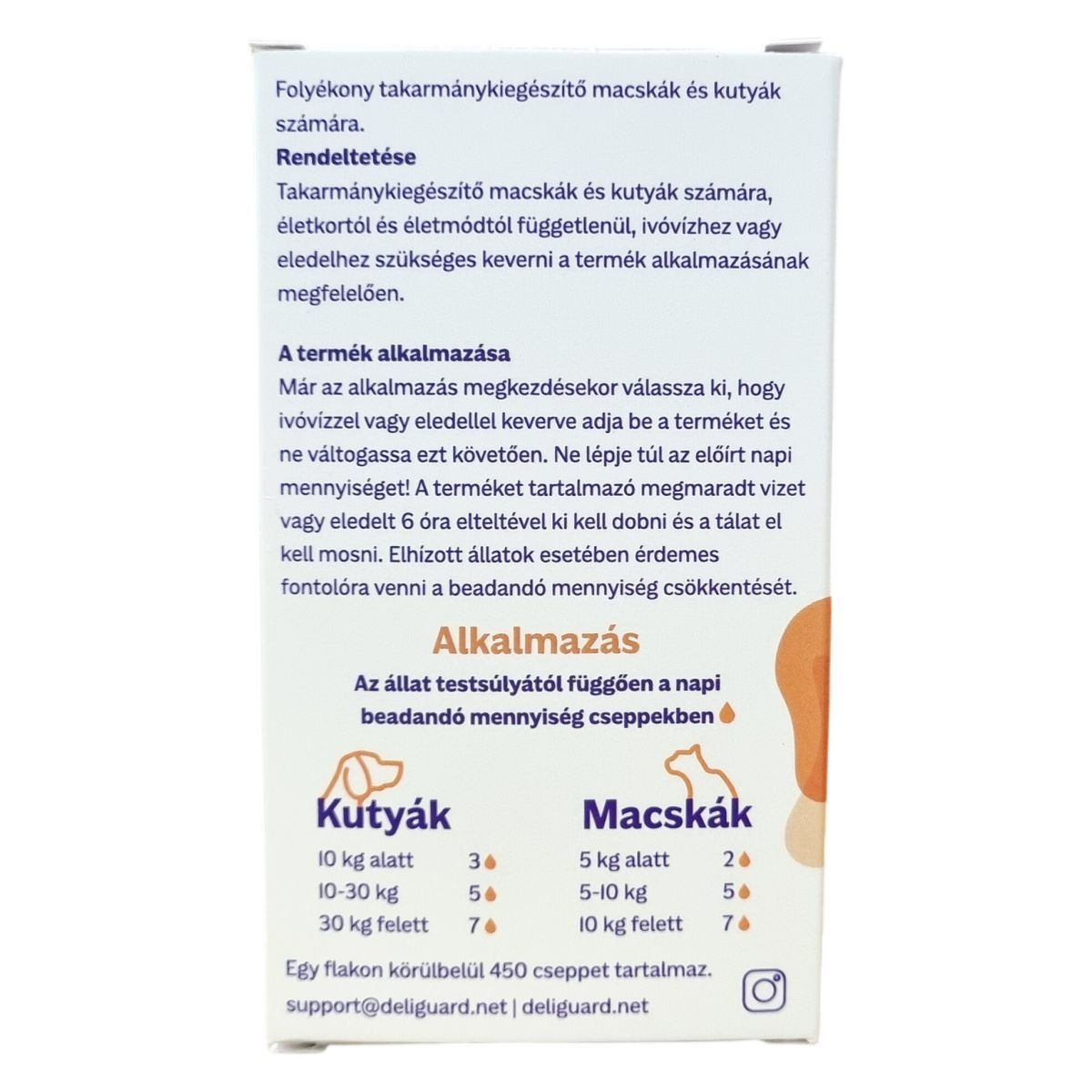 A DeliGuard a bélrendszer posztbiotikus támogatását biztosítja kedvenceink szemmel látható egészségéért. A készítmény alkalmazása hozzájárulhat a jó emésztéshez, a fényes szőrzethez és a megnövekedett étvágyhoz. Életkortól és életmódtól függetlenül adható kutyák és macskák számára. Már az alkalmazás megkezdésekor válassza ki, hogy ivóvízzel vagy eledellel keverve adja be a terméket, és ezt követően ne váltogassa. Egy flakon körülbelül 450 cseppet tartalmaz. Minőségét megőrzi a termék előállításának dátumától számított 12 hónapig. Nyilvántartási szám: αPL3064029p (BioDose), αHU 13 2 00206 (Vitamed Pharma Kft.).