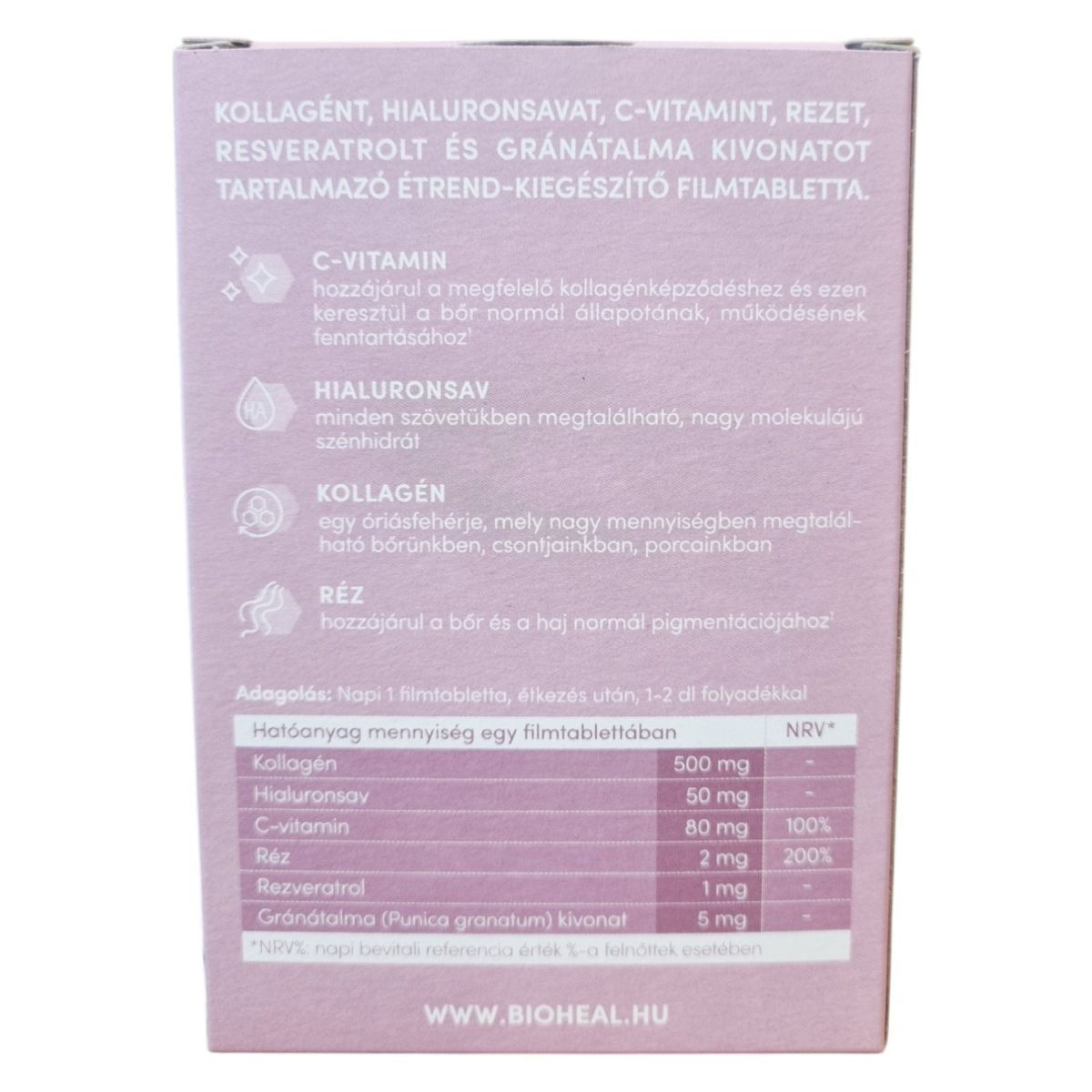A Bioheal Kollagén & Hialuronsav étrend-kiegészítő filmtabletta kollagént, hialuronsavat, C-vitamint, rezet, rezveratrolt és gránátalma kivonatot tartalmazhat, amelyek hozzájárulhatnak a bőr normál állapotának fenntartásához.
