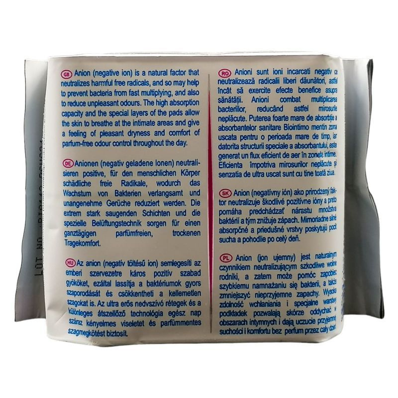 15 db Anionos intim szárnyas tisztasági betét 18x6,5cm, menstruációra vagy a hüvelyi nedvesség felfogására.