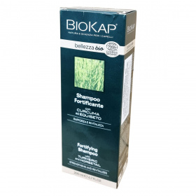 A Biokap erősítő sampon különleges hatóanyagokat tartalmaz, melyek között a kurkuma rizóma peptidei és a mezei zsurló kivonat, mely gazdag szilíciumban, a hajszálakat revitalizálja és erősíti, így a haj dúsabb, volumentelibb hatású lesz. A termék növényi eredetű kókuszolaj alapú felületaktív anyagokat használ, amelyek gyengéden tisztítanak, megőrizve a fejbőr természetes egyensúlyát. A sampon 97,97%-ban természetes eredetű összetevőket tartalmaz, melyekből 12,96% bio gazdaságból származik. A termék vegán, parabén-, paraffin-, ásványi olaj-, szilikon-, GMO-mentes, és dermatológiailag tesztelt. A csomagolás 100%-ban újrahasznosított PET anyagból készült, és megfelel a COSMOS ORGANIC szabványoknak, melyet az Ecocert Greenlife tanúsít. A sampon használata hozzájárul a haj egészségéhez, megfelelő gondoskodást nyújtva a mindennapi hajápolásban.