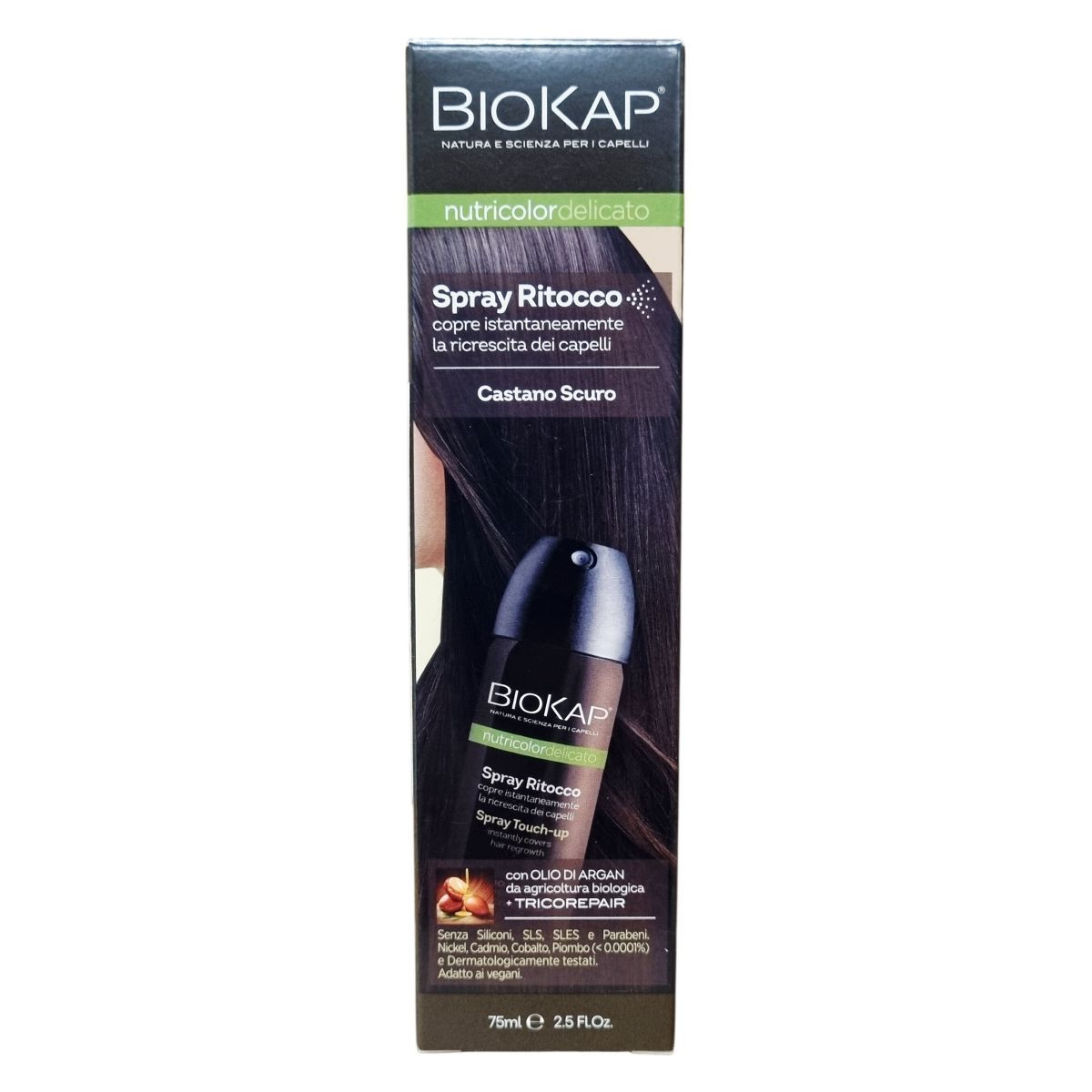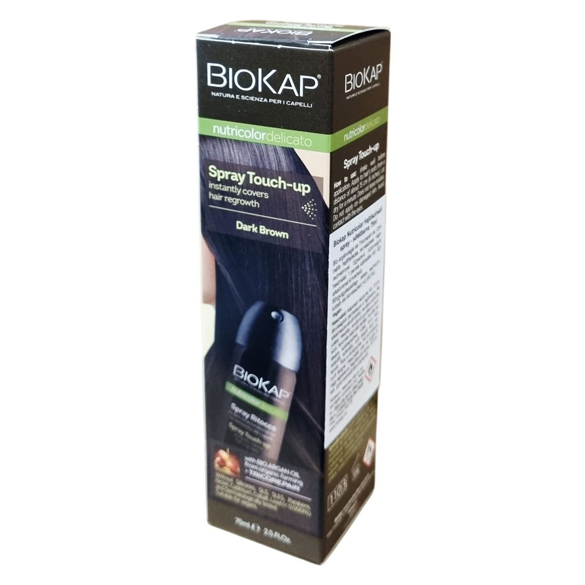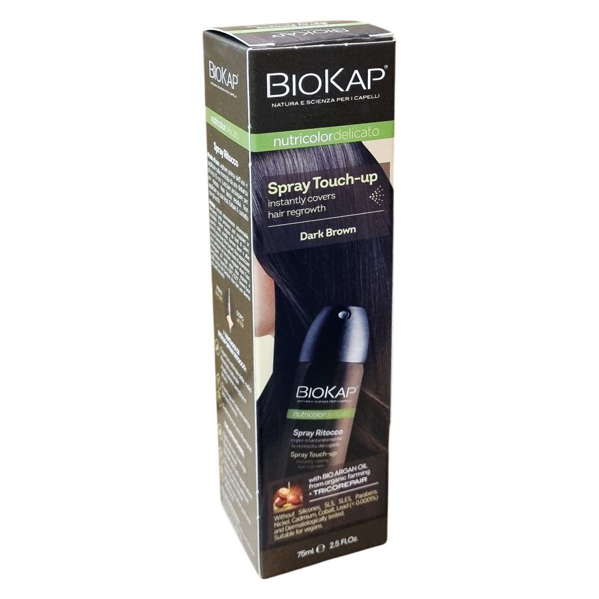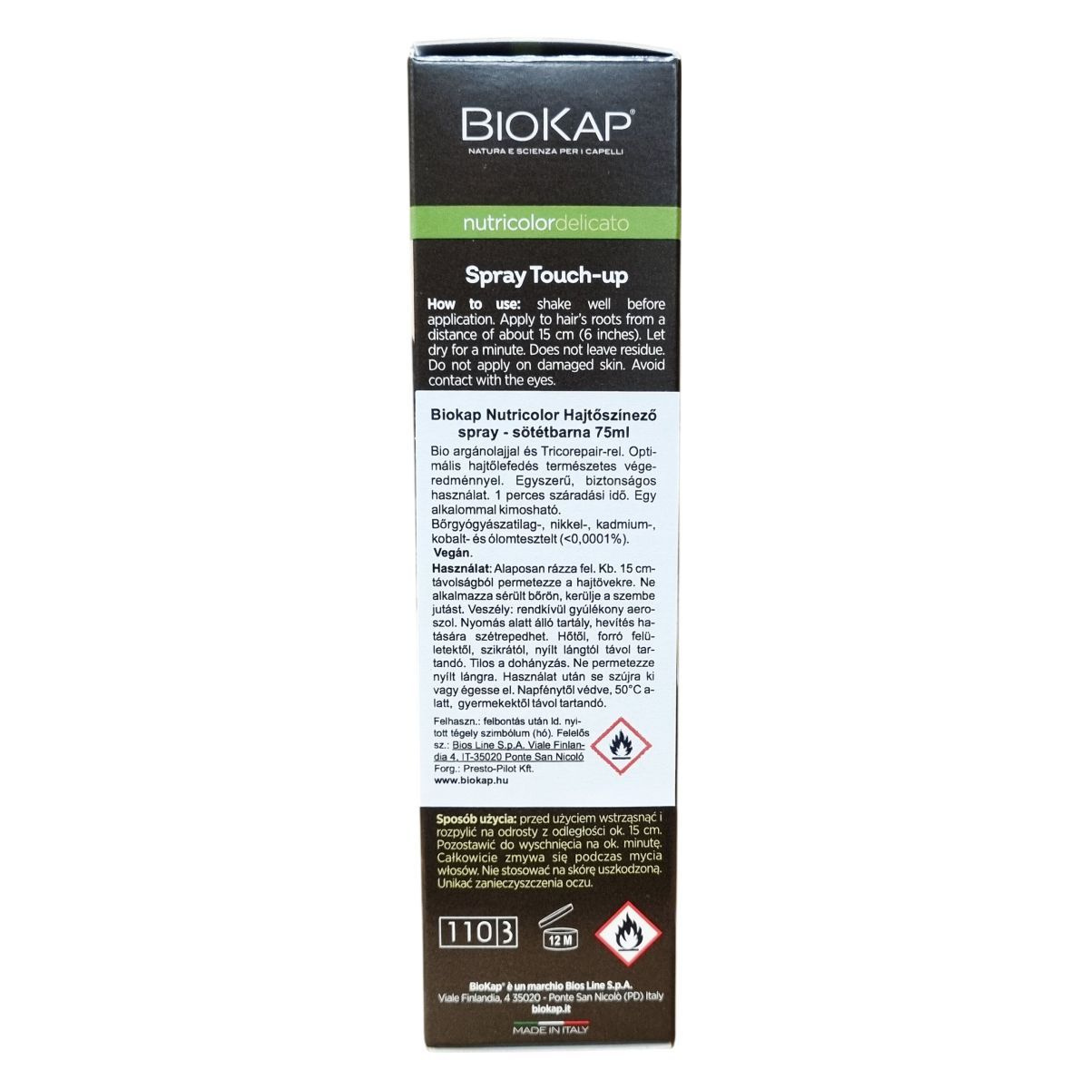 A BIOKAP Nutricolordelicato Spray Touch-up egy sötétbarna hajfesték spray, mely bio argánolajjal és Tricorepair-rel gazdagított, így különösen kíméletes. A spray optimális fedést biztosít a hajtöveken természetes végeredménnyel, mindössze egyperces száradási idővel, és egy mosással könnyen kimosható. A termék mentes szilikonoktól, SLS-től, parabénektől, valamint nehézfémektől és bőrgyógyászatilag tesztelt, így vegánok számára is ideális. Használata egyszerű és biztonságos, azonban fontos betartani a biztonsági előírásokat, mivel a spray aeroszol formátumú és rendkívül gyúlékony. Felbontás után a csomagoláson jelzett időn belül használható fel. A termék környezettudatos, papírdobozban csomagolt és az újrahasznosítási előírásokat figyelembe véve kezelendő.