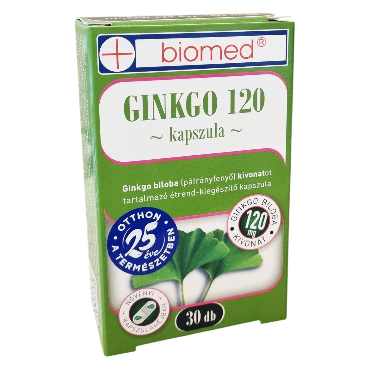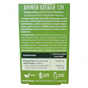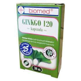 A Biomed GINKGO 120 kapszula Ginkgo biloba (páfrányfenyő) levél kivonatát tartalmazza standardizált formában, mely ellenőrzött mennyiségben tartalmaz flavon glikozidokat (24%) és terpén laktonokat (6%). A Ginkgo biloba ősi növény, amely a természetben kiemelkedő ellenállóképességgel rendelkezik. A termék nettó tömege 13,50 g, és 30 darab, egyenként 450 mg-os kapszulát tartalmaz, melynek kapszulahéja növényi eredetű. Forgalmazója a Biomed Kft., mely Magyarországon működik.