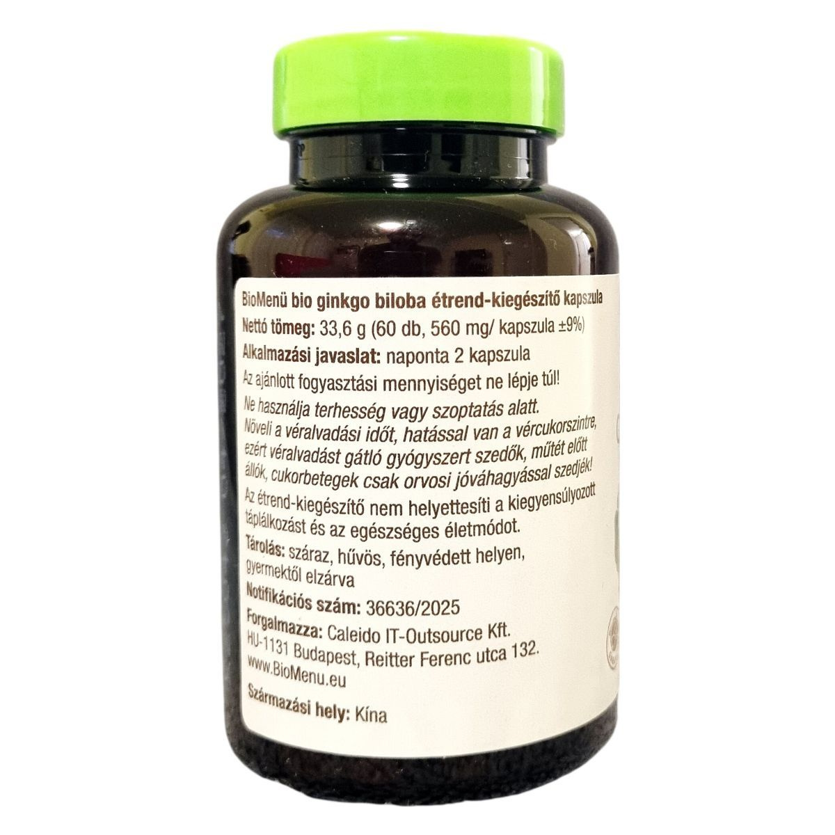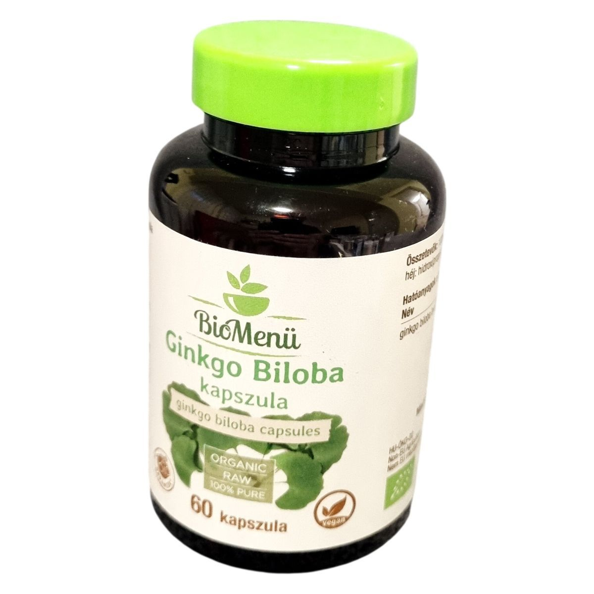 A BioMenü bio ginkgo biloba kapszula nettó tömege 33,6 g, amely 60 darab, egyenként 560 mg tömegű kapszulát tartalmaz. A készítmény földrajzi eredete Kína, és Non-EU Agriculture minősítésű, az ellenőrzést a HU-ÖKO-02 szervezet végzi. A kapszula héja hidroxipropil-metil-cellulózból készül, így megfelel a vegán étrend követelményeinek. Fontos, hogy az ajánlott napi mennyiséget ne lépje túl, és a termék használata előtt bizonyos egészségügyi állapotok esetén érdemes orvossal konzultálni.