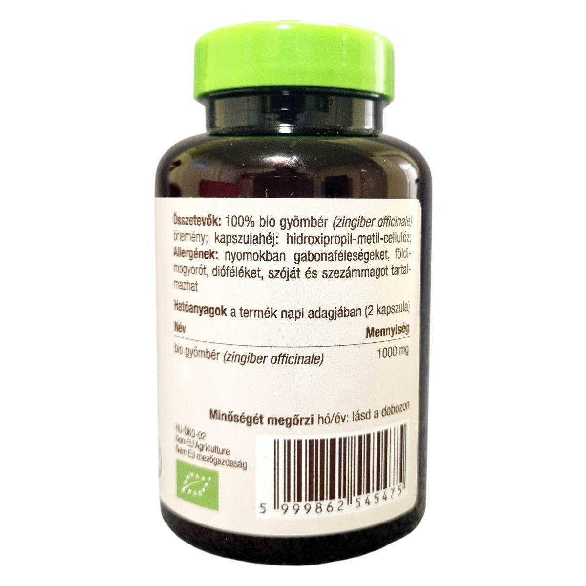 100% bio gyömbér (zingiber officinale) őrlemény, kapszulahéj: hidroxipropil-metil-cellulóz