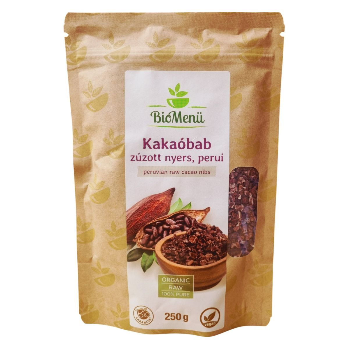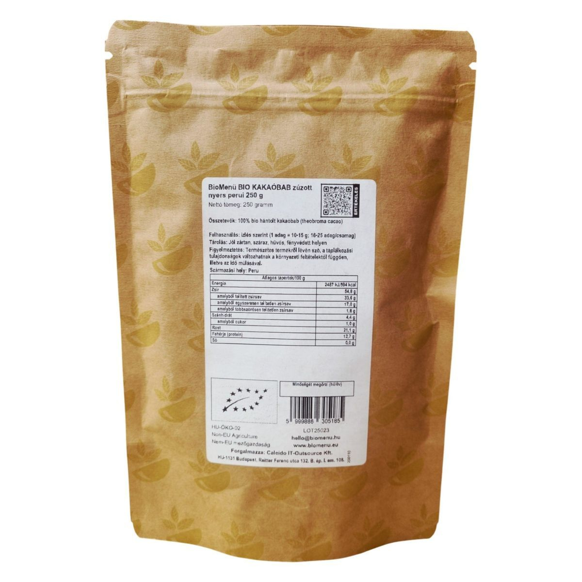 A BioMenü BIO KAKAÓBAB zúzott nyers perui termék 250 grammos kiszerelésben kapható. A termék 100% bio hántolt kakaóbabból készül, amelyet Peruból származtatnak. A termék organikus, nyers és vegán minősítéssel rendelkezik, így ideális választás a természetes és egészséges életmód követőinek. A termék energia- és tápérték adatai alapján gazdag zsírban és rostban, miközben alacsony cukortartalommal bír. A termék tárolása során fontos, hogy száraz, hűvös és fényvédett helyen tartsuk. A termék HU-ÖKO-02 tanúsítvánnyal rendelkezik, és a Caleido IT-Outsource Kft. forgalmazza.