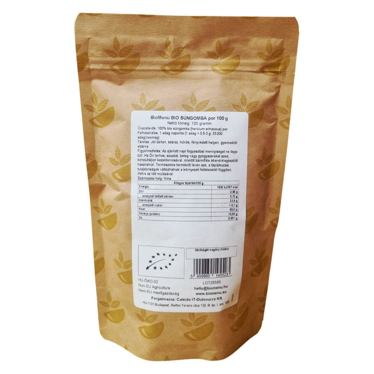 A BioMenü BIO SÜNGOMBA por 100 g-os kiszerelésben kapható, és 100% bio süngombát tartalmaz. A termék Kínából származik, és a Bio GARANCIA minősítéssel rendelkezik. A süngomba, más néven hericium erinaceus, egy különleges gomba, amelyet gyakran használnak az egészséges életmód támogatására. A termék nemcsak bio, hanem vegán is, így széles körben alkalmazható különböző étrendi irányzatokban. A termék csomagolása 33-200 adagot tartalmaz, az adagolástól függően. A termék minőségét megőrzi a megfelelő tárolási körülmények között, és fontos, hogy a fogyasztók betartsák az ajánlott napi mennyiséget. A termék forgalmazója a Caleido IT-Outsource Kft., amely Budapesten található.