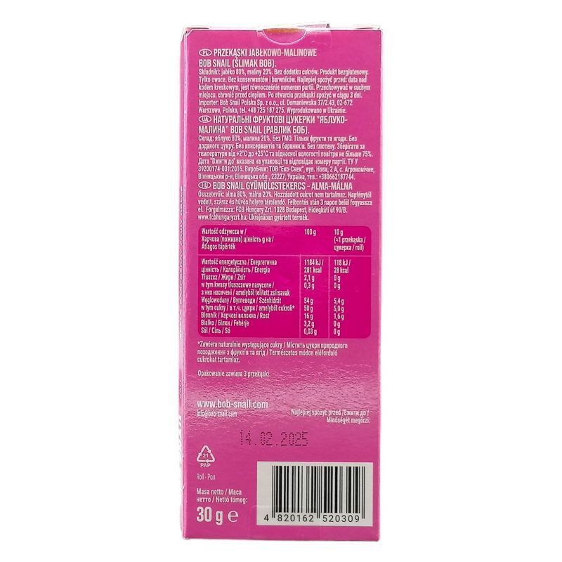 A Bob Snail gyümölcstekercs alma-málna ízével egy különleges édességet kínál, amely kizárólag természetes gyümölcsökből készült. Ez a 30 grammos tekercs tökéletes választás mindazok számára, akik szeretnék élvezni a gyümölcsök friss ízét anélkül, hogy hozzáadott cukrokkal vagy mesterséges adalékanyagokkal találkoznának. Az alma és a málna harmonikus kombinációja egyedi ízélményt nyújt, amely nemcsak finom, hanem tápláló is. A gyümölcstekercsek praktikus formátumuknak köszönhetően könnyen magunkkal vihetők, így ideálisak uzsonnára, kirándulásokra vagy bármilyen alkalomra, amikor egy kis édességre vágyunk. A Bob Snail gyümölcstekercs nemcsak ízletes, hanem egészséges alternatívát is kínál a hagyományos édességekkel szemben, hiszen a gyümölcsök természetes tápanyagaival hozzájárulhatunk a napi vitaminbevitelünkhöz.