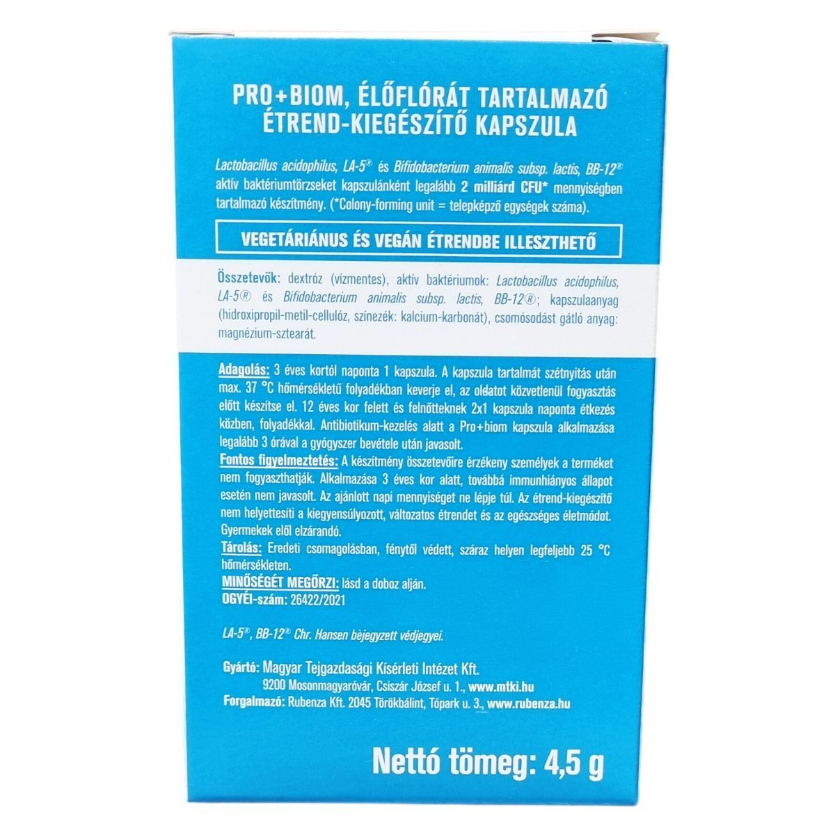 dextróz (vízmentes), Lactobacillus acidophilus, LA-5®, Bifidobacterium animalis subsp. lactis, BB-12®, kapszulaanyag (hidroxipropil-metil-cellulóz, színezék: kalcium-karbonát), magnézium-sztearát