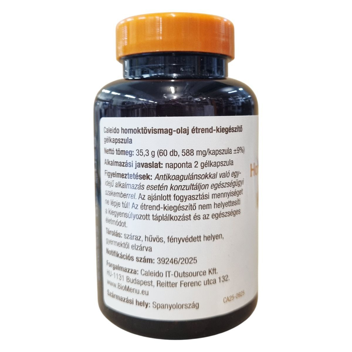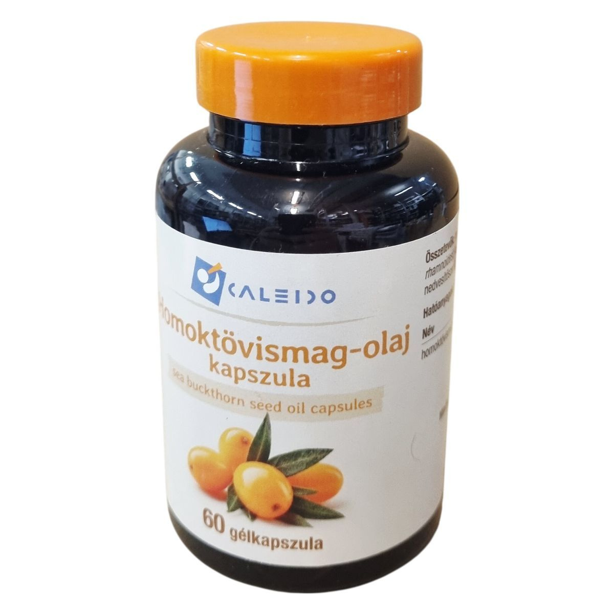 A Caleido homoktövismag-olaj kapszula nettó tömege 35,3 g, amely 60 darab, egyenként 588 mg-os gélkapszulát tartalmaz. Az összetevők között szerepel a homoktövismag-olaj, amely a Hippophae rhamnoides növényből származik, valamint a kapszulahéj anyagai, a szarvasmarha zselatin és a nedvesítőszerként használt glicerin. A termék származási helye Spanyolország. A termék alkalmazása során fontos betartani az ajánlott napi mennyiséget, és figyelembe venni, hogy egyes gyógyszerekkel – különösen antikoagulánsokkal – való egyidejű használata előtt érdemes szakemberrel konzultálni. A tárolásra vonatkozóan ajánlott a terméket száraz, hűvös és fényvédett helyen tartani, gyermekektől elzárva. A termék nem helyettesíti a változatos, kiegyensúlyozott étrendet és az egészséges életmódot.