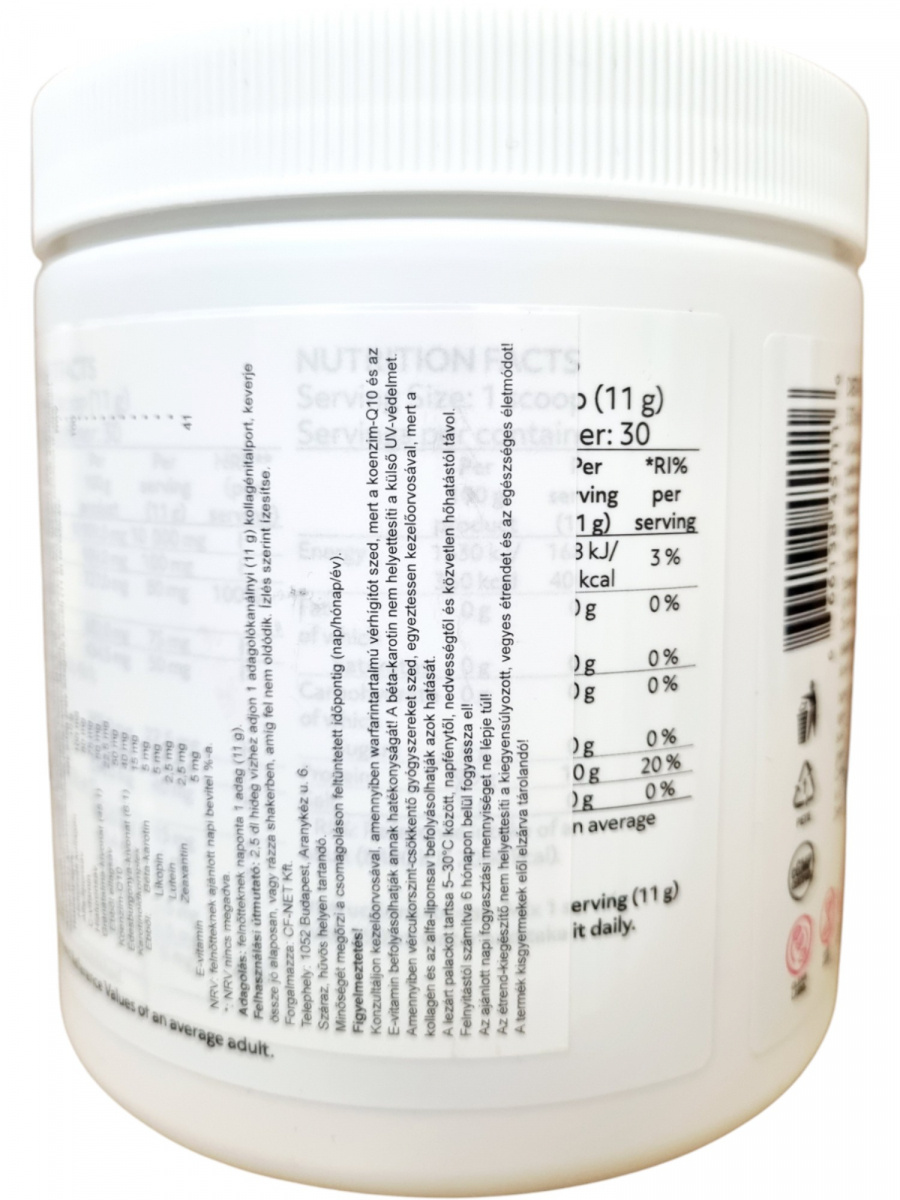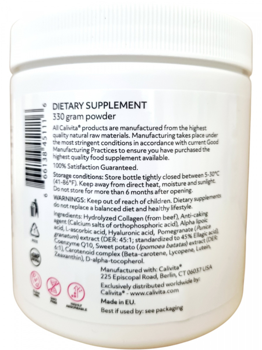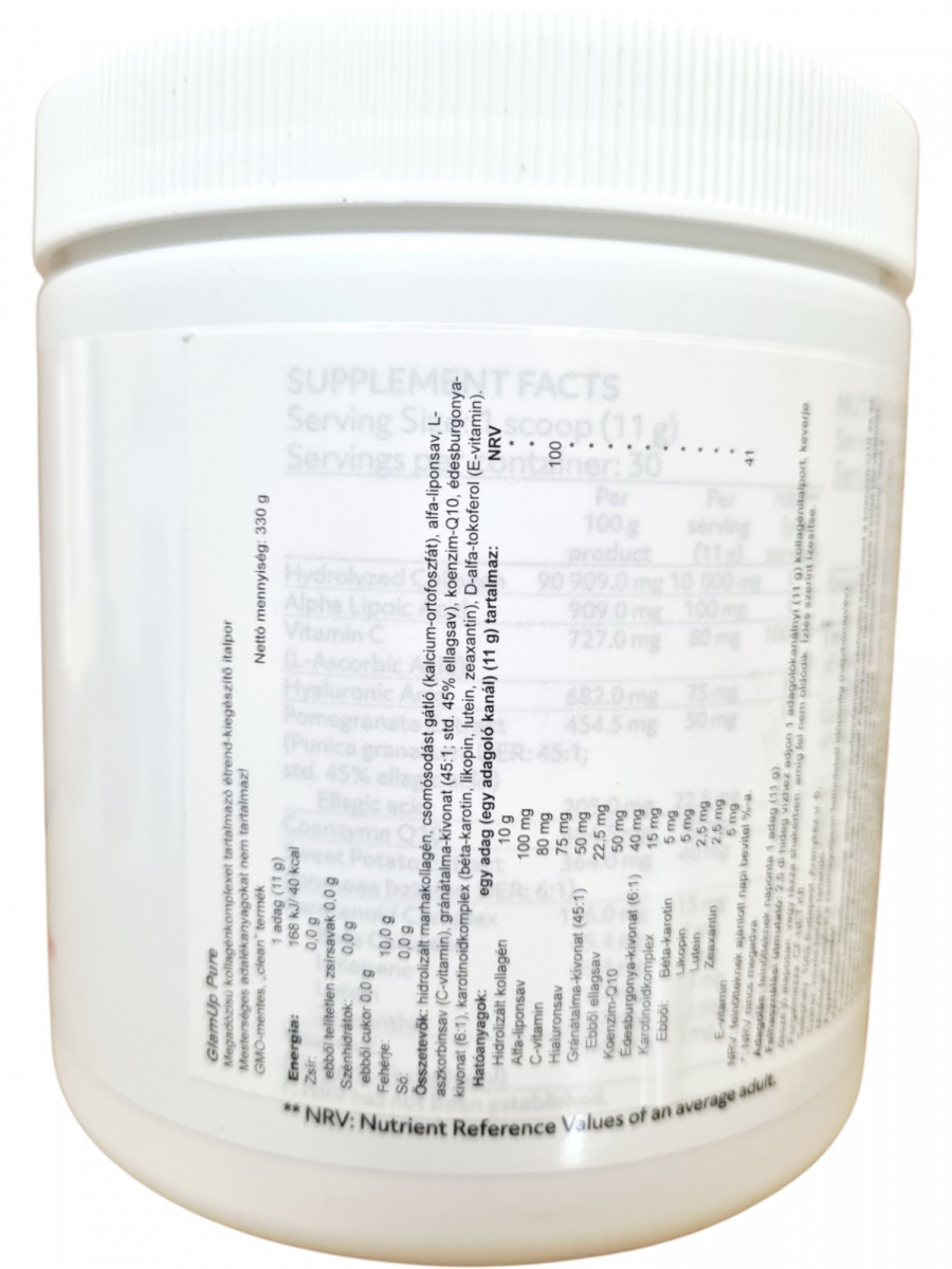 A Calivita GlamUp Pure egy 330 g-os kollagén komplex por, amely megadott napi adagban hidrolizált marhakollagént és többféle antioxidáns, vitamin és növényi kivonat kombinációját tartalmazza. A formula olyan összetevőket foglal magába, mint a hialuronsav, gránátalma-kivonat, koenzim Q10, édesburgonya-kivonat és karotinoid komplex. A címkén hangsúlyozott a termék magas minősége és a gyártási folyamat szigorú ellenőrzése. Az összetevők együttesen hozzájárulhatnak a bőr rugalmasságának, a kötőszövetek és ízületek normál állapotának támogatásához. A praktikus por forma lehetővé teszi, hogy könnyen adagolható és beilleszthető legyen a mindennapi étrendbe.