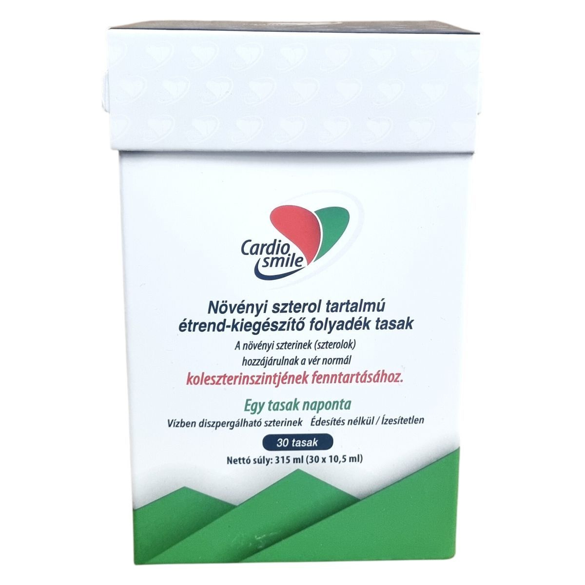 A Cardiosmile egy szabadalmaztatott, klinikailag tesztelt, nanopartikuláris diszperziós technológián alapuló vízoldékony formula, amely vízbázisú növényi szterol készítményt tartalmaz. A termék 2 gramm növényi szterolt biztosít tasakonként, amely hozzájárulhat a normál vérkoleszterinszint fenntartásához. A magas koleszterinszint rizikófaktora lehet a szívkoszorúér-betegség kialakulásának, ezért a termék fogyasztása támogathatja a koleszterinszint szabályozását. A termék édesítés és ízesítés nélkül készült, így bármilyen hideg vagy meleg italhoz vagy ételhez adható. Használat előtt a tasak felrázandó, majd közvetlenül elfogyasztható vagy az ételbe keverhető. A termék kizárólag azok számára ajánlott, akiknek szükségük van ilyen étrend-kiegészítőre, és nem pótolja a kiegyensúlyozott étrendet vagy az egészséges életmódot.