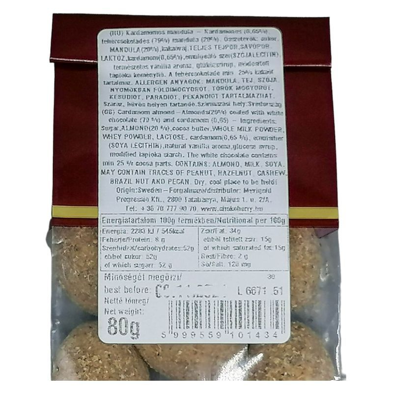 Kardamonos (0,65%), fehércsokoládés (79%) mandula (20%) csokoládé különlegességünk minőségi mandulát tartalmaz, prémium csokoládé köntösbe öltöztetve a kardamon ízvilágának felejthetetlen harmóniájával párosítva.