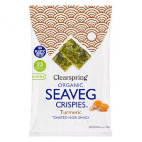 A kurkumás ízesítésű ropogós nori alga lapok csupán négy összetevő felhasználásával készültek.