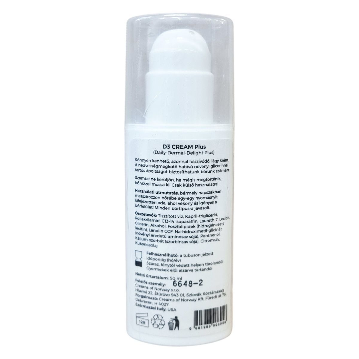 A D3 CREAM Plus egy lágy állagú, könnyen felszívódó krém, amely növényi glicerint tartalmaz a bőr hosszú távú hidratáltságának fenntartásához. A termék kifejezetten a vékony, igényes bőrfelületek ápolására készült, alkalmas minden bőrtípusra. Használata egyszerű, bármikor alkalmazható az arc és más érzékeny területeken. A krém tartalmaz továbbá panthenolt és növényi eredetű aminosav sóját, amelyek támogatják a bőr regenerálódását és védelmét. A termék összetevői között megtalálhatóak emolliensek és bőrbarát anyagok, mint a lanolin és a lecitin, melyek segítik a bőr védőrétegének helyreállítását. A csomagolás 50 ml-es tubus, amely egyszerű használatot, és higiénikus adagolást biztosít.