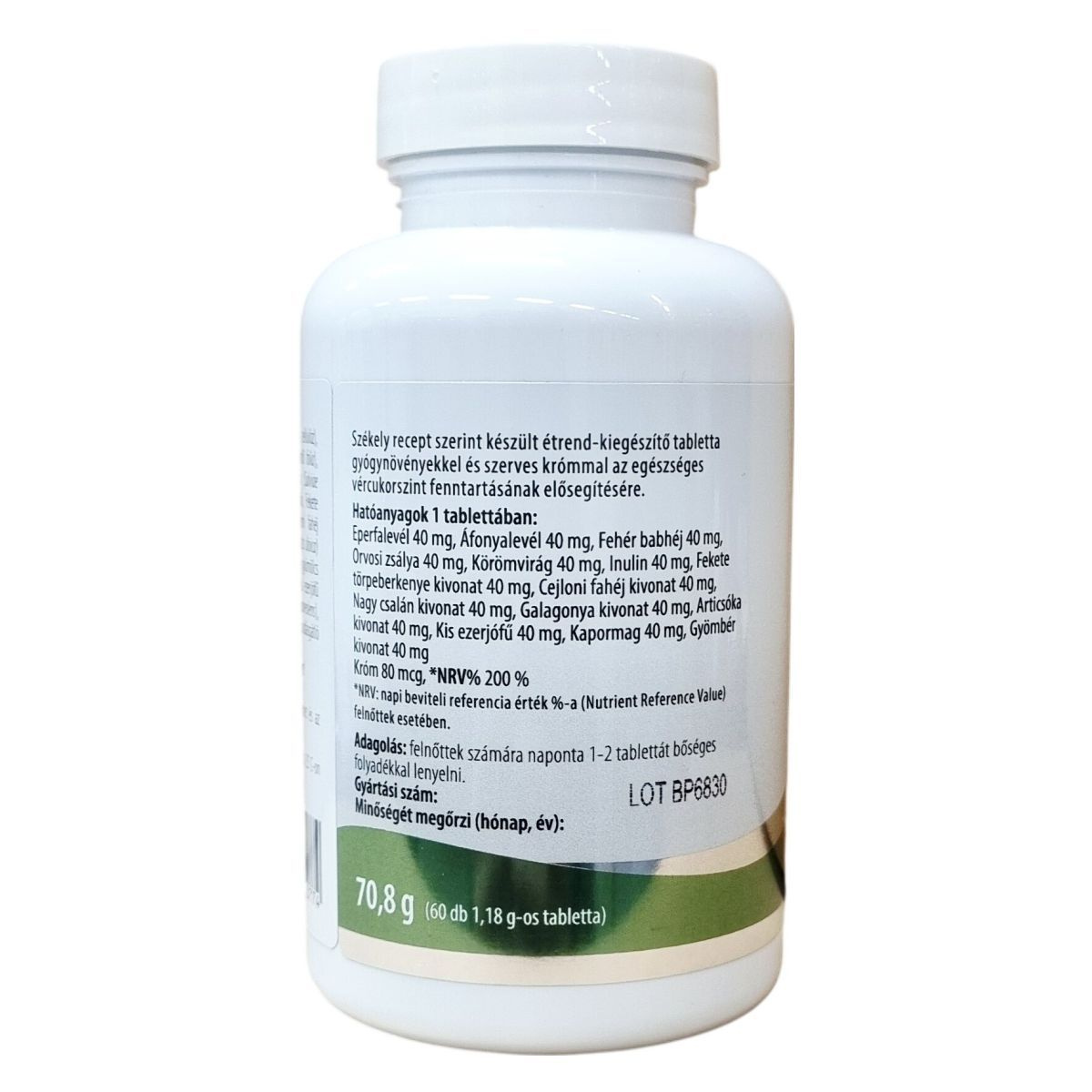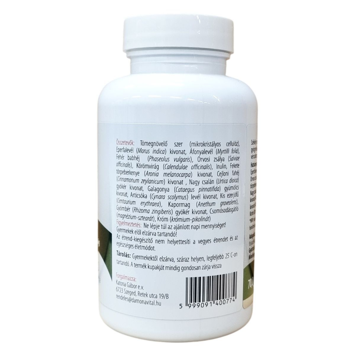 Tömegnövelő szer (mikrokristályos cellulóz), Eperfalevél (Morus indica) kivonat, Áfonyalevél (Myrtilli folia), Fehér babhéj (Phaseolus vulgaris), Orvosi zsálya (Salviae officinalis), Körömvirág (Calendulae officinalis), Inulin, Fekete törpeberkenye (Aronia melanocarpa) kivonat, Cejloni fahéj (Cinnamomum zeylanicum) kivonat, Nagy csalán (Urtica dioica) gyökér kivonat, Galagonya (Cataegus pinnatifida) gyümölcs kivonat, Articsóka (Cynara scolymus) levél kivonat, Kis ezerjőfű (Centaurium erythraea), Kapormag (Anethum graveolens), Gyömbér (Rhizoma zingiberis) gyökér kivonat, Csomósodásgátló (magnézium-sztearát), Króm (krómium-pikolinát)