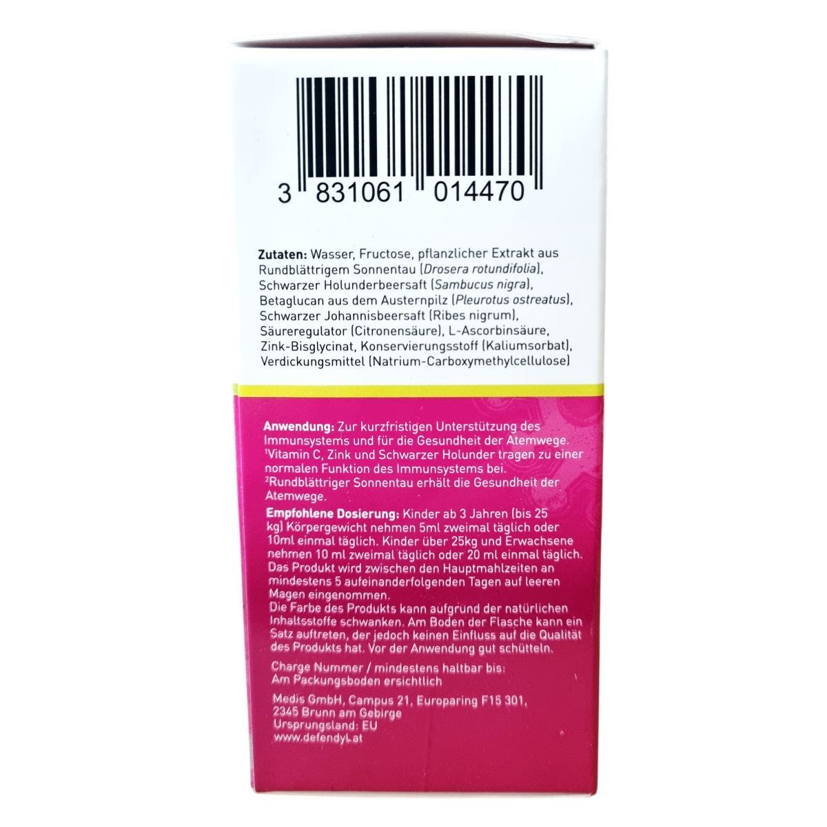 víz, fruktóz, kereklevelű harmatfű (Drosera rotundifolia) kivonat, fekete bodza (Sambucus nigra) gyümölcslé, betaglükán osztrigagombából (Pleurotus ostreatus), fekete ribizli (Ribes nigrum) gyümölcslé, savanyúságot szabályozó anyag (citromsav), C-vitamin (L-aszkorbinsav), cink-biszglicinát, tartósítószer (kálium-szorbát), sűrítőanyag (nátrium-karboxi-metil-cellulóz)