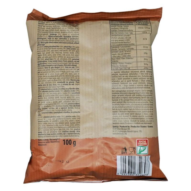 Teljes kiőrlésű, paradicsom-bazsalikom ízesítésű kréker, amely ropogós textúrával és gazdag ízzel szolgál.