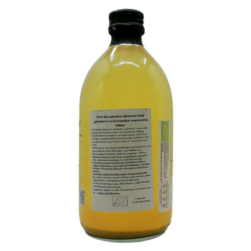 Az ecet egészséges tulajdonságai miatt ideális összetevőként használható öntetekhez, salátákhoz, gyógyteákhoz vagy vízben higítva. Az erjesztés során keletkező “anyának" köszönhető a bio, szűretlen almaecet fúzió egészségre gyakorolt élettani hatása. Ebben a különleges almaecet fúzióban megtalálható a gyömbér ereje, a kurkuma harmóniája és a chili fűszeressége. A gyömbér többek között féken tartja a cukorbetegséget, javítja a szív egészségét, segít megelőzni a megfázást, enyhíti a menstruációs fájdalmat, enyhíti a migrént. A kurkuma növeli a test antioxidáns kapacitását, fokozza a vérkeringést. Az ecet fogyasztása javasolt mindennapi frissítőként teákhoz, reggeli turmixokban a nap megfelelő indításához, esti jeges italokhoz. Fűszerként grillezett zöldségekhez különösen ajánlott. Összetevők: bio almaecet, bio kurkuma, bio gyömbér, csípős chili paprika, természetes aroma. Savasság 1,5%. Szulfitokat tartalmazhat.