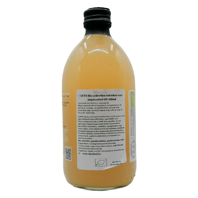 Az ecet egészséges tulajdonságai miatt ideális összetevőként használható öntetekhez, salátákhoz, gyógyteákhoz vagy vízben higítva. Az erjesztés során keletkező “anyának" köszönhető a bio, szűretlen fehérborecet egészségre gyakorolt élettani hatása. A bio fehérborecet nem tartalmaz semmilyen hozzáadott anyagot csak a természetes úton keletkezett, a borokból származó összetevőket. A borecet kiváló ízesítő szív- vagy keringési rendellenességben szenvedők számára is, mivel alacsony zsírtartalmú. Gluténmentes, alacsony cukortartalmú. Azon kívül, hogy az emésztésnek is jót tesz, segít csökkenteni a vérnyomást és a koleszterinszintet is. Rengeteg kálium van benne, és igen magas az antioxidáns tartalma is. a benne lévő kalcium fontos a csontritkulás megelőzése szempontjából, a magnézium erősíti a szívet, a vas segíti a vérképzést, a kálium pedig sejt- és szövetnövelő, másrészt energiával tölt fel a mindennapokban. Összetevők: bio fehérbor. Szulfitokat tartalmaz. Savasság 6%.