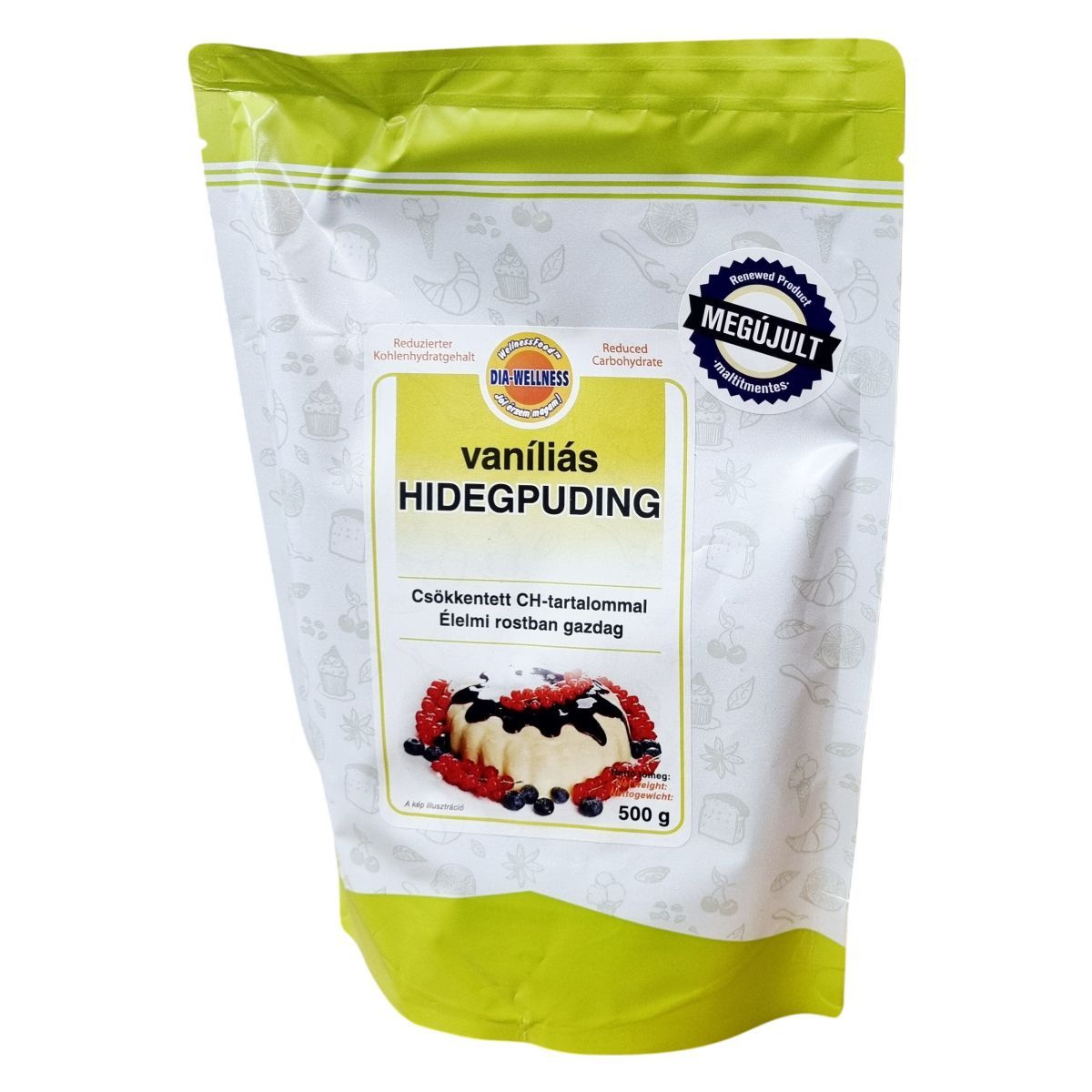 A Dia-wellness vaníliás hidegpuding cukorhelyettesítőkkel, eritrittel és szukralózzal édesített, csökkentett szénhidráttartalmú termék. Kiemelten gazdag élelmi rostokban, amelyek cikóriából és kukoricából származnak. Tartalmaz továbbá zsíros tejport, tejsavóport, valamint színezékeket, mint a béta-karotin, lutéin és karminsav. A sűrítésről módosított burgonyakeményítő gondoskodik, míg a polidextroz és maltodextrin a tömegnövelést szolgálják. A termék nettonettó tömege 500 g, megújult receptúrával készül, és hűvös, száraz helyen tárolandó. A doboz tartalmaz magyar nyelvű információkat az elkészítésről és az összetevőkről, valamint felhívja a figyelmet a kiegyensúlyozott táplálkozás fontosságára. A termék édesítése és összetétele miatt vércukorszint-emelkedése kisebb lehet, mint a hagyományos cukrot tartalmazó hidegpudingoké.