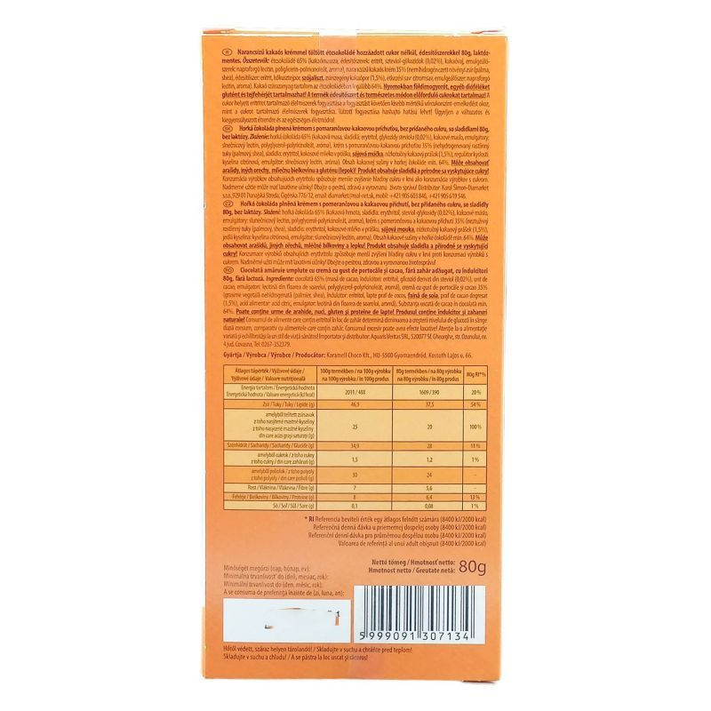 Összetevők: étcsokoládé 65% (kakaómassza, édesítőszerek: eritrit, szteviol-glikozidok (0,02%), kakaóvaj, emulgeálószerek: napraforgó lecitin, poliglicerin-poliricinoleát, aroma), narancsízű kakaós krém 35% (nem hidrogénezett növényi zsír (pálma, shea), édesítőszer: eritrit, kókusztejpor, szójaliszt, zsírszegény kakaópor (1,5 %), étkezési sav: citromsav, emulgeálószer:napraforgó lecitin, aroma.).