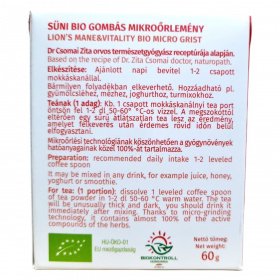 A SÜNI BIO GOMBÁS MIKROŐRLEMÉNY Dr. Csomai Zita orvos természetgyógyász receptúrája alapján készült. A termék különleges összetevői, mint a süngomba és a ganoderma, hozzájárulhatnak az egészség támogatásához. A mikroőrlesi technológiának köszönhetően a gyógynövények hatóanyagainak közel 100%-át tartalmazza. A termék bio minősítésű, gluténmentes, laktózmentes, hozzáadott cukrot nem tartalmaz, és tartósítószer-mentes. Az ajánlott napi bevitel 1-2 csapott mokkáskanál, amely bármilyen folyadékban elkeverhető. A termék különösen ajánlott azoknak, akik természetes módon szeretnék támogatni egészségüket.